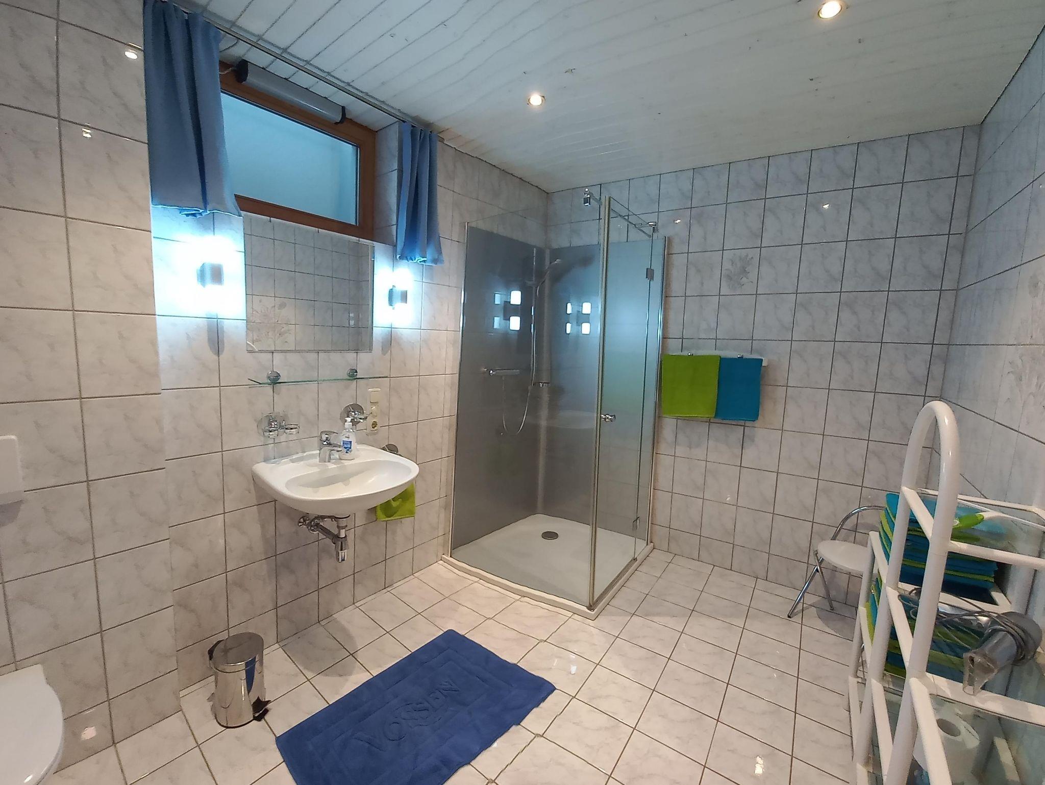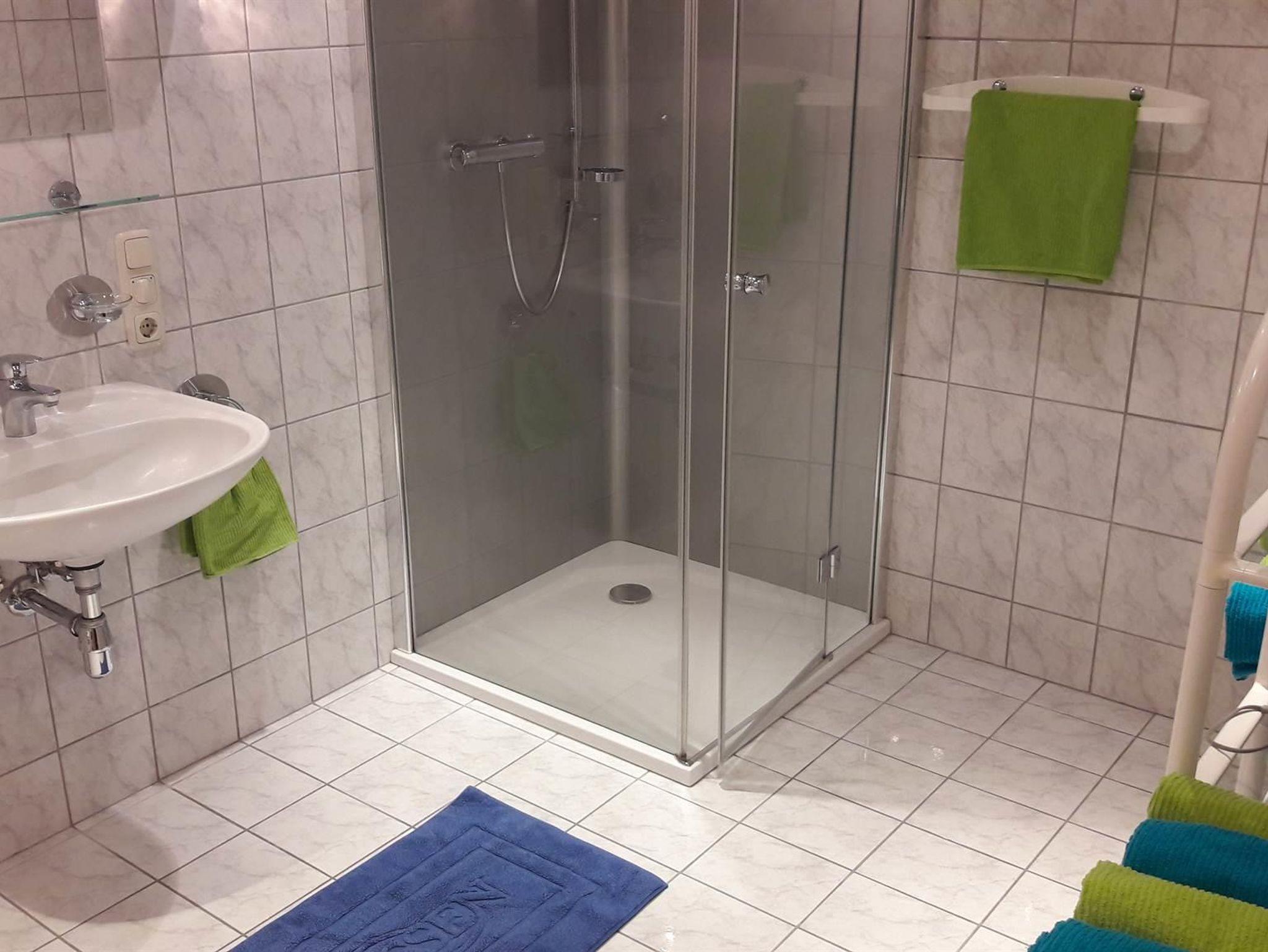 - 1 geräumiges Badezimmer mit Hand- und Duschetücher und Haartrockner