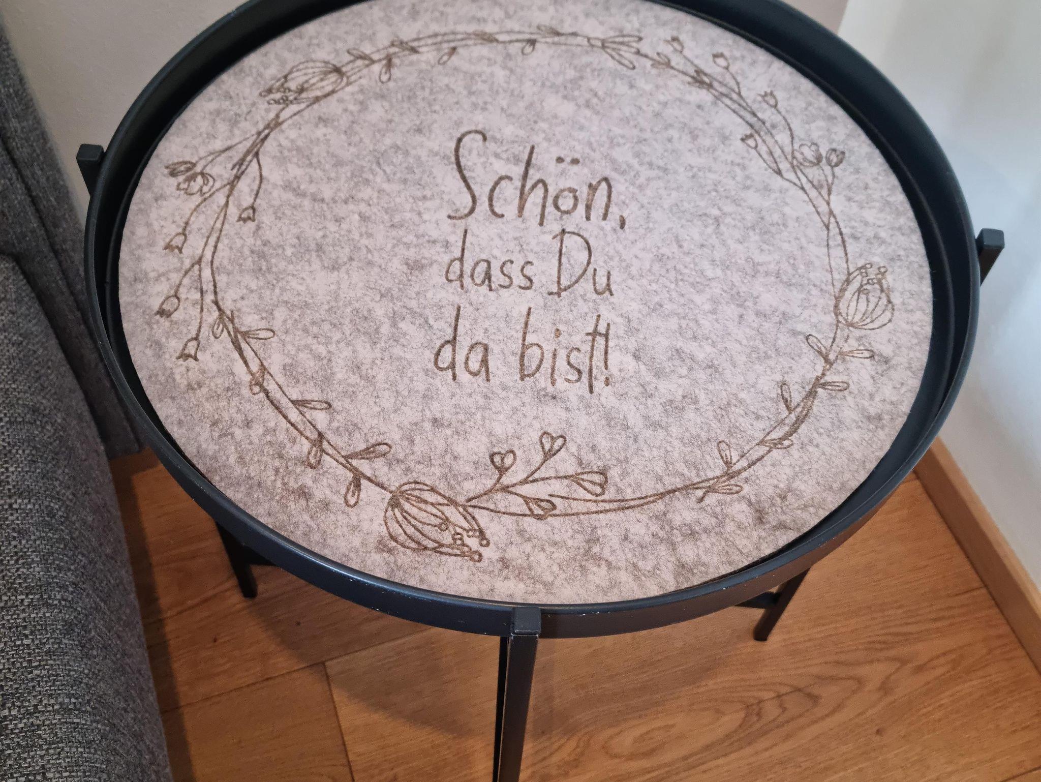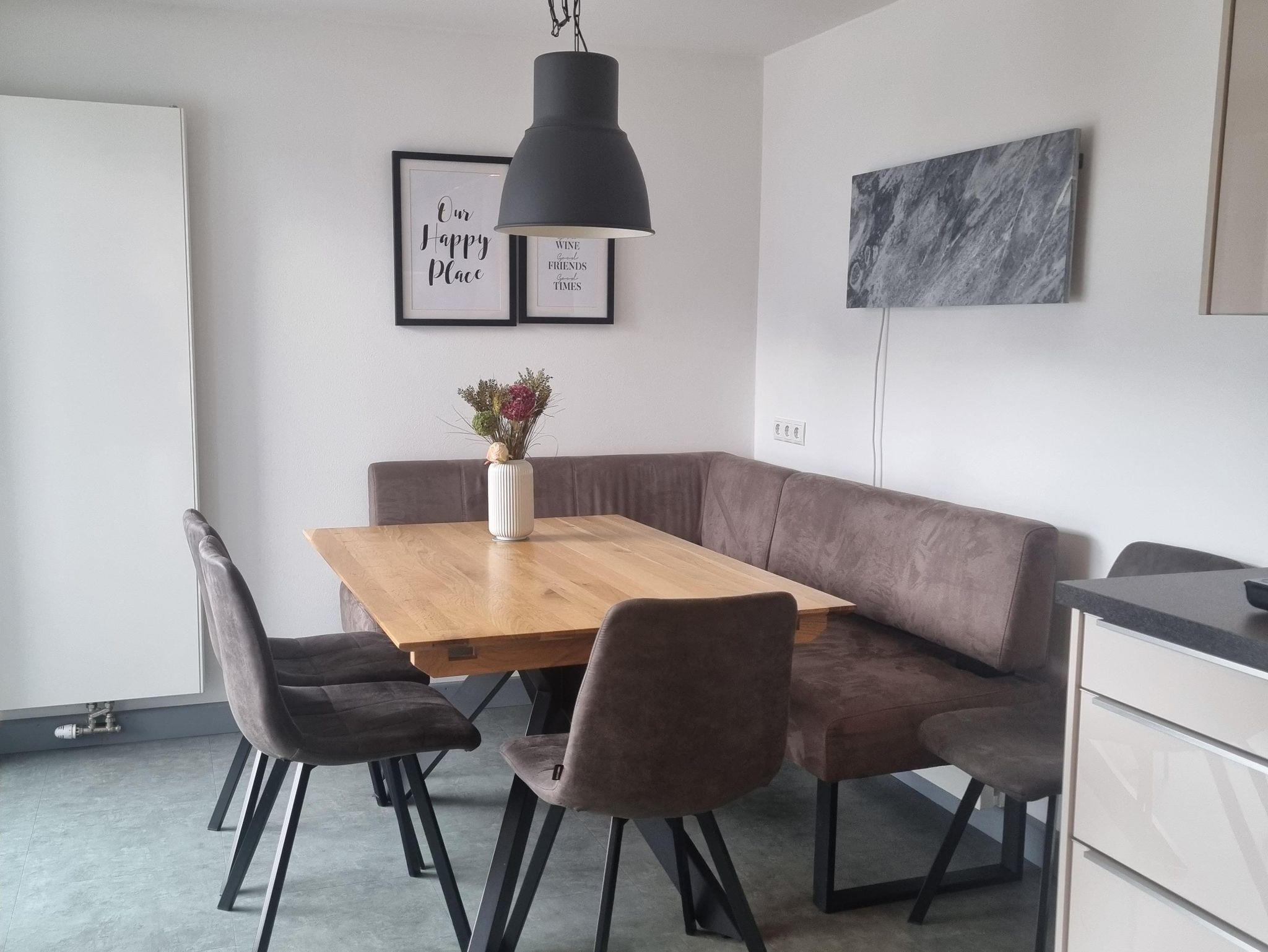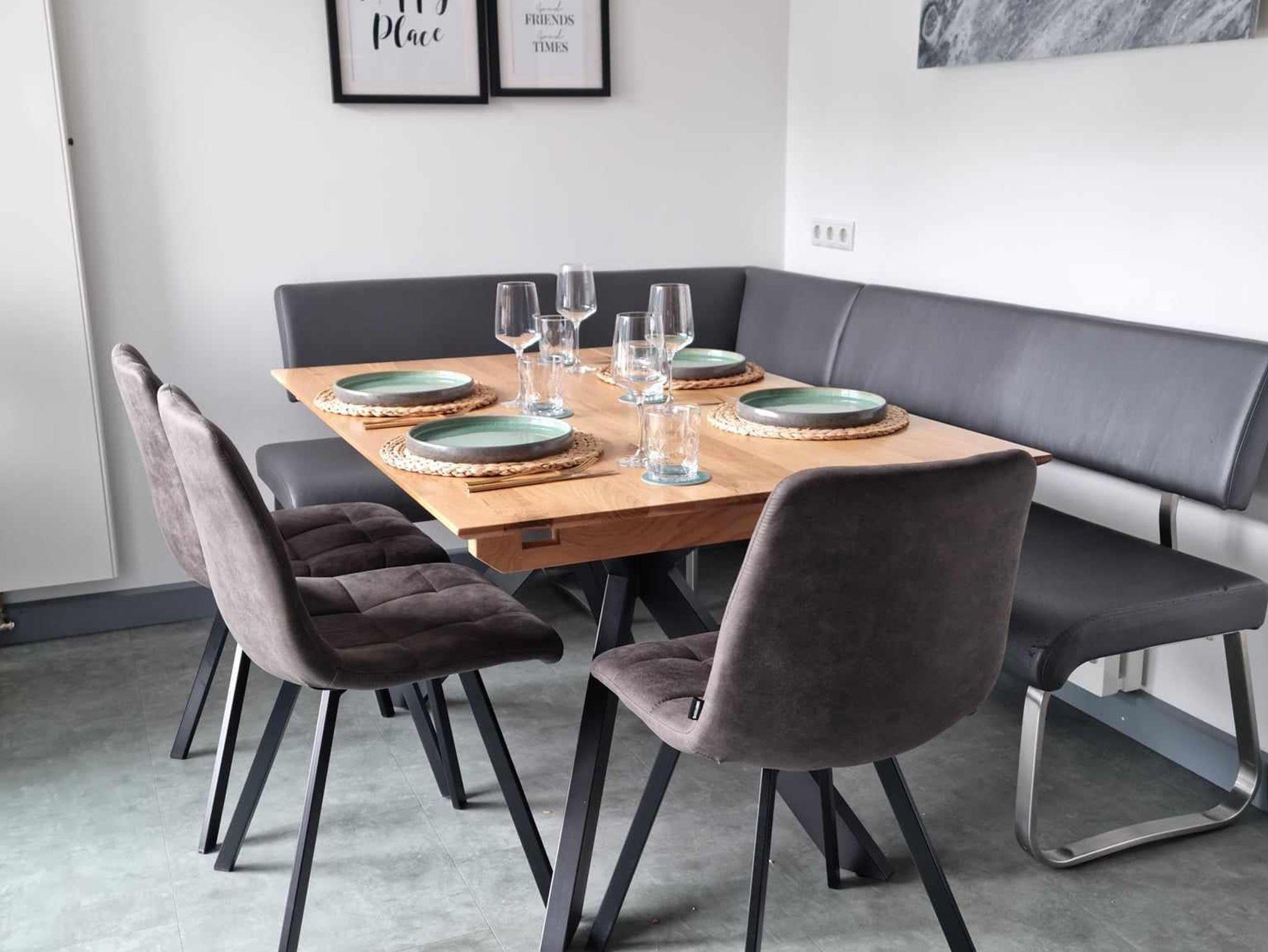 Unser Esstisch ist mit einer vorhandenen Ansteckplatte auf 1,80 m erweiterbar (ca. f. 9 Personen).