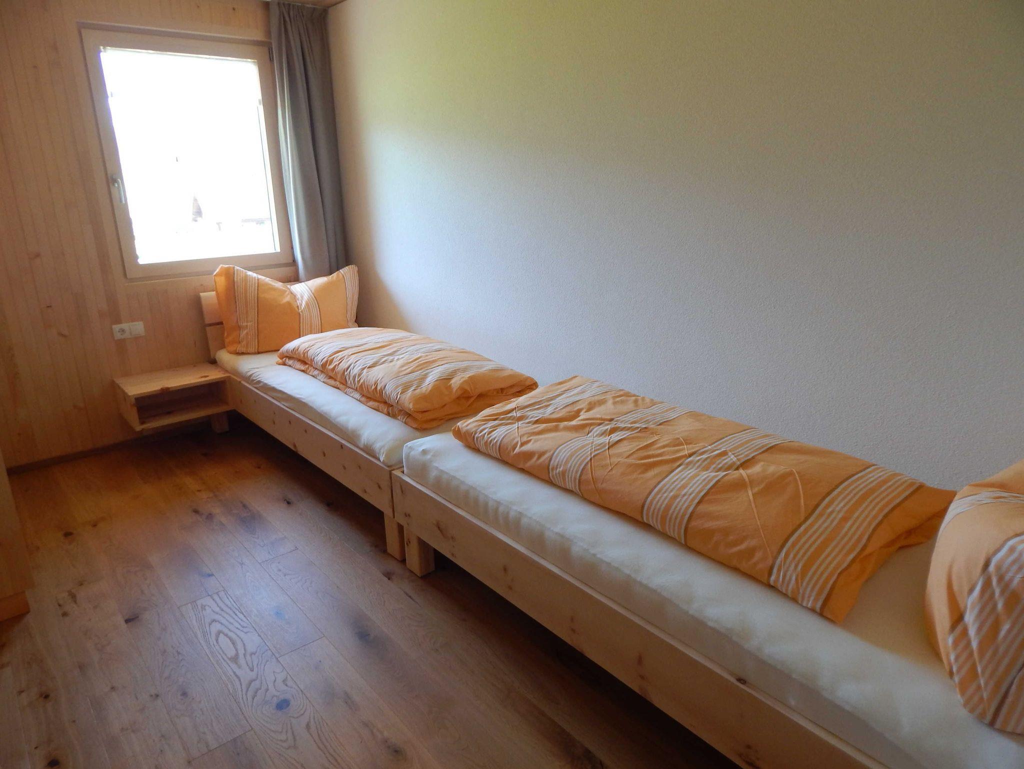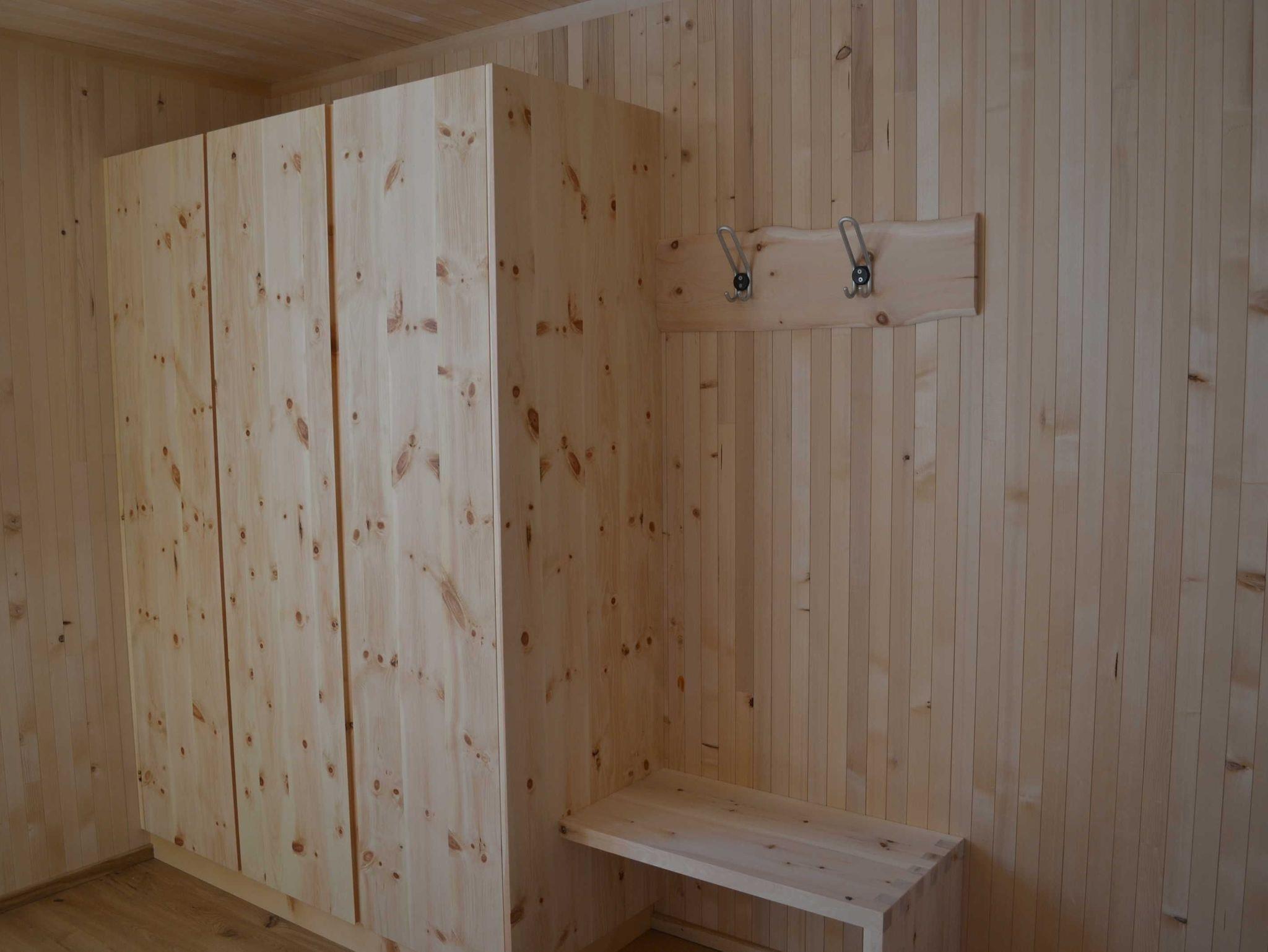 Großzügige Ferienwohnung in Massivholzbauweise: Heimelige Atmophäre Zirbendoppelbett, Balkon direkt vom Wohnraum begehbar. Herrlicher Blick in die Natur.