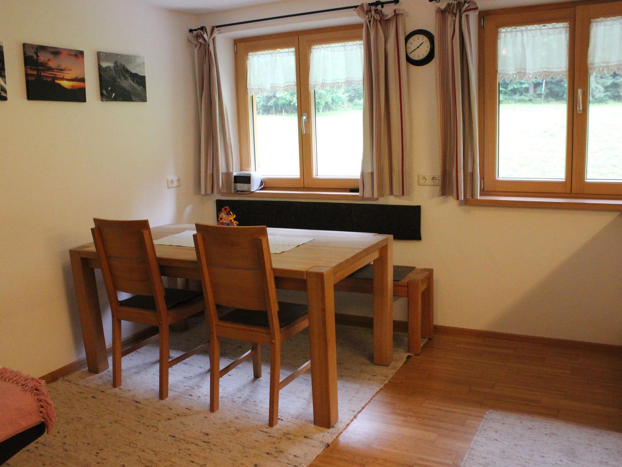 Ferienwohnung im Bregenzerwald ist 61 qm groß, ideal für Familien und Gruppen von bis zu 5 Personen. Die Wohnung hat 2 Schlafzimmer, eine gemütliche Wohnküche die mit Cerankochfeld, Backofen, Geschirrspülmaschine, Mixer, Kaffeemaschine, Kühlschrank, Tiefkühlfach, Toaster, Wasserkocher und allem Gechirr was benötigt wird ausgestattet ist. Im Bad sind Dusche, Badewanne, Föhn und natürlich Handtücher vorhanden. WC. Zusätzlich finden Sie in der Wohnung einen Skischuhtrocker, der auch für Wanderschuhe geeignet ist, so können Sie mit warmen Füßen in einen tollen Wintersporttag starten. Der dazugehörige Balkon lädt im Sommer zu einem gemütlichen Frühstück mit Morgensonne ein und abends um den Tag mit einem Glas Wein ausklingen zu lassen. Unser großer Garten ist mit Sandkasten, Schaukel, Spielhäuschen, einem großen Trampolin, jede Menge Fahrzeuge ideal für Kinder. Gerne können Sie täglich frische Eier von unseren glücklichen Hühnern und Bienenhonig von unseren Bienen bekommen (inklusive Führung durch das Bienenhaus).