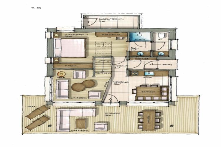Stueetage: (Indgang , Stue(Fjernsyn, pejs, sofahjørne), åbent køkken(spisebord, kogeplade(Komfur med fire kogeplader, glaskeramisk), elkedel, brødrister, kaffemaskine, ovn, opvaskemaskine , køle-fryseskab, vaskemaskine), soveværelse(dobbeltseng), badeværelse(bruser, håndvask, toilet), terrasse) På 1. etage: (Soveværelse med badeværelse(dobbeltseng, bruser, håndvask, toilet), sauna) garage, garage, havemøbler, parkering, barnestol, crib(free)