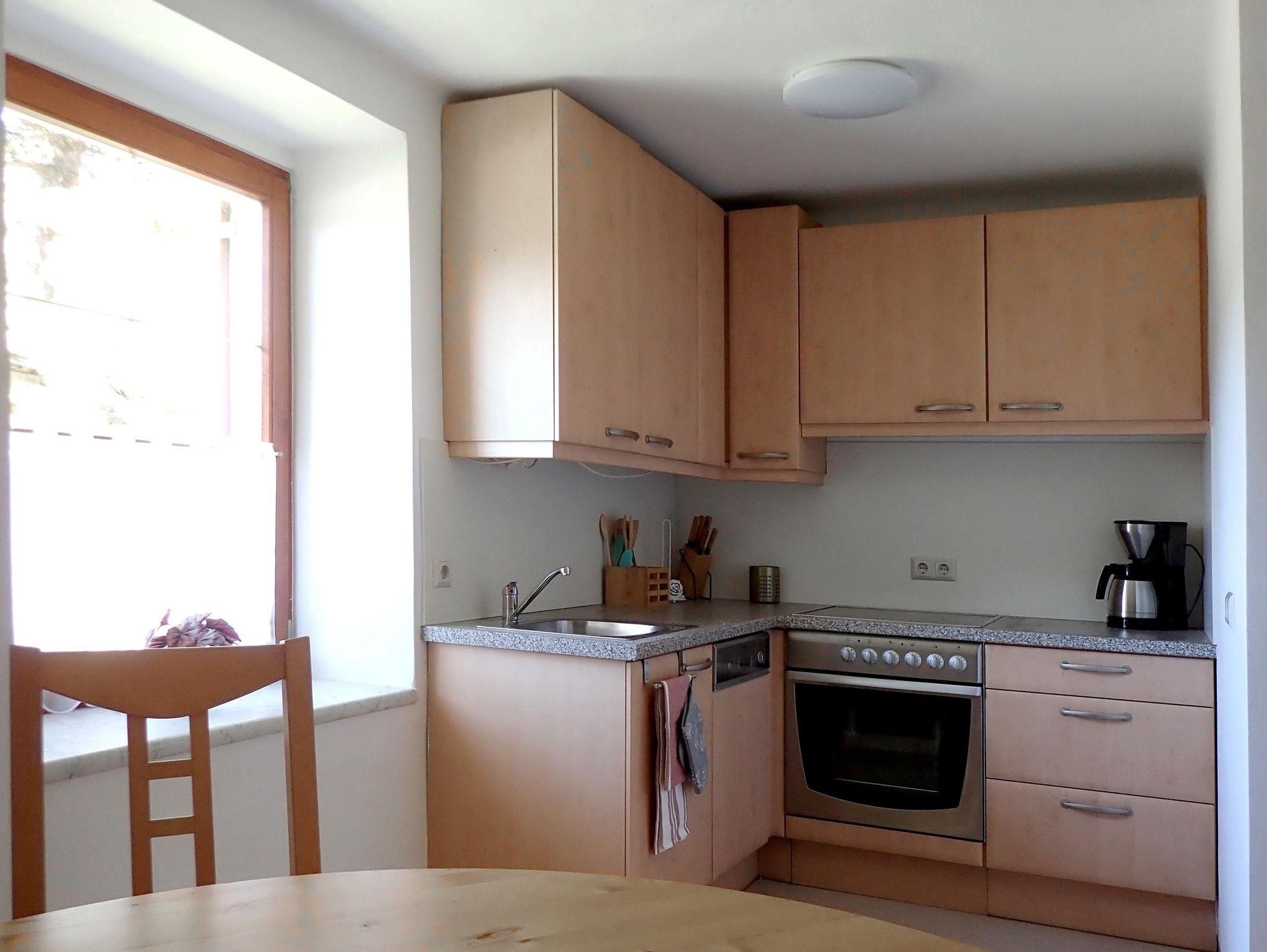 Das separate Haus bietet eine Küche mit Esstisch, ein Schlafzimmer mit Doppelbett, ein kleines Zimmer mit Schreibtisch und ein Badezimmer mit Dusche und WC. Zwischen Kellerstöckl und einem angrenzenden alten Stallgebäude liegt eine geschützte Terrasse.