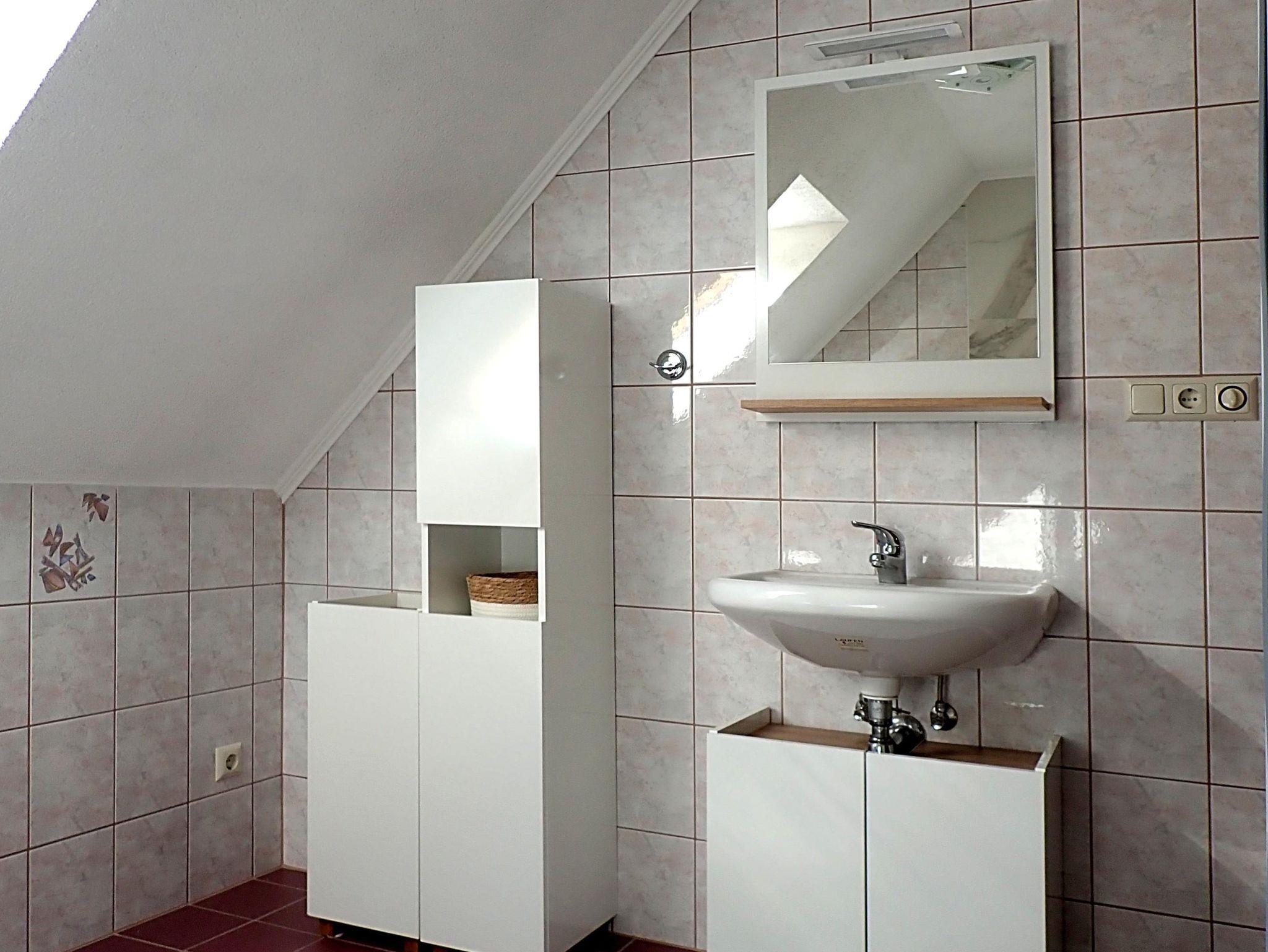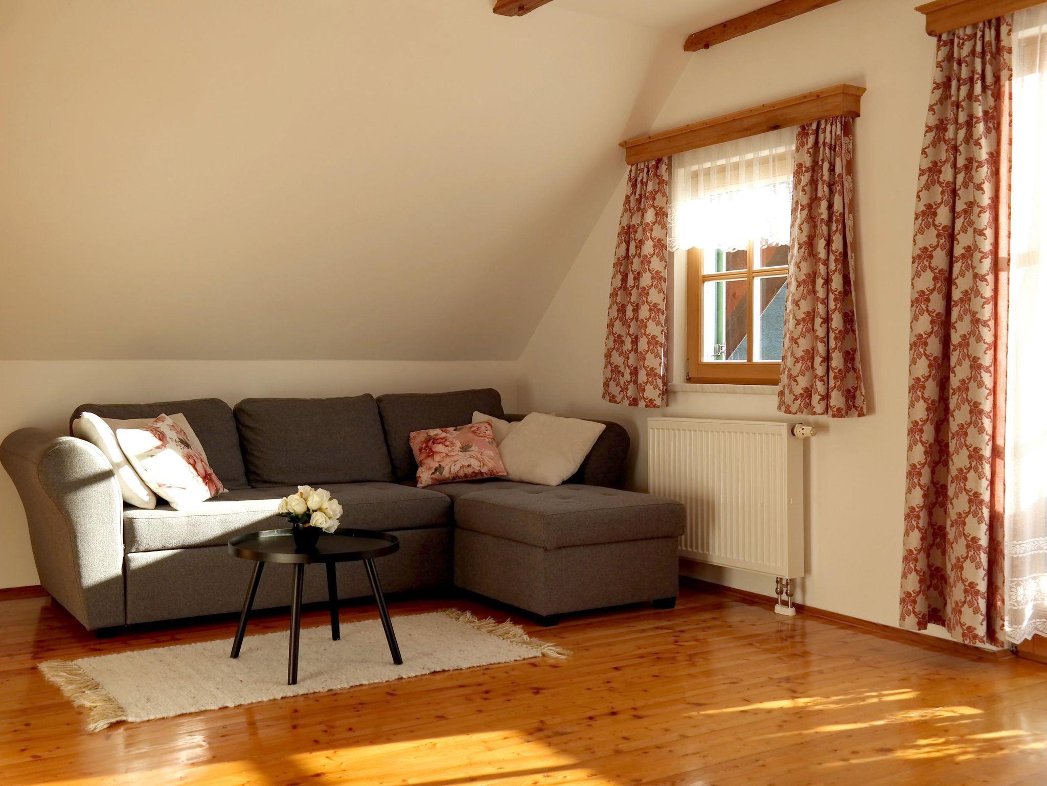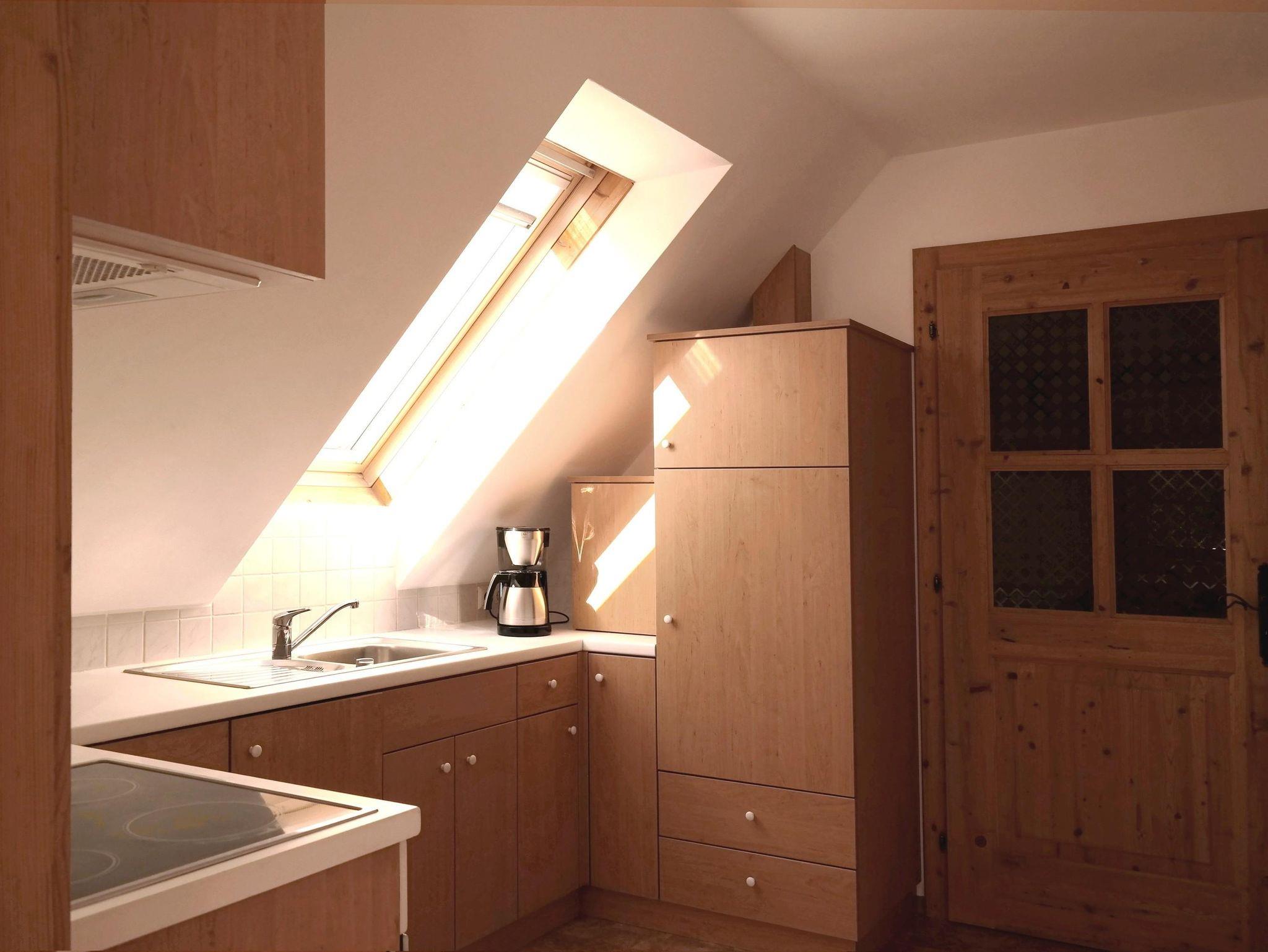 Die Mansarden-Wohnung besteht aus einer Stube mit Esstisch und einem ausziehbaren Ecksofa, einer Küche, einem Schlafzimmer mit Doppelbett, einem Badezimmer mit Dusche und einem getrennten WC.