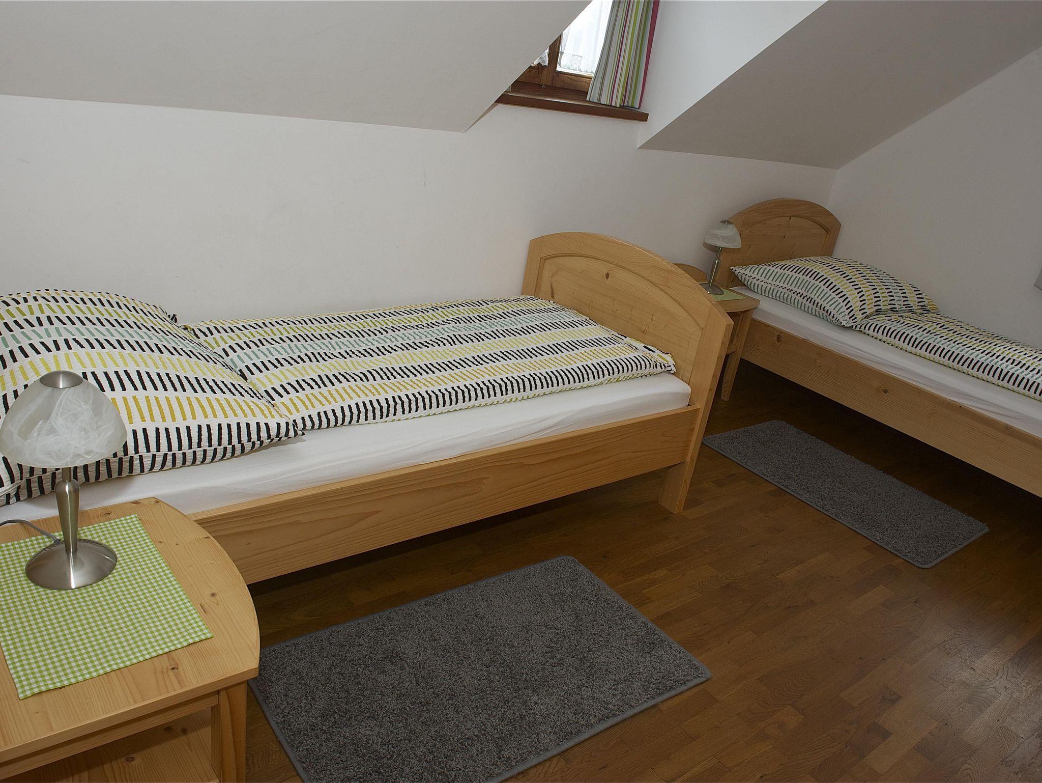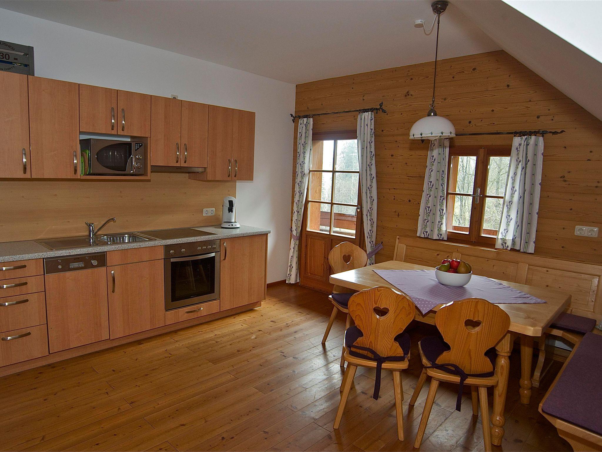 Die 55m² große Ferienwohnung ist mit Massivholzmöbeln ausgestattet. Die Küche ist voll ausgestattet mit Geschirrspüler, Mikrowelle, Kühlschrank, E-Herd mit Backrohr, Eierkocher, Wasserkocher, Toaster und Kaffeemaschine. Dort befindet sich auch eine gemütliche Sitzecke mit Sat-TV. Die Ferienwohnung bietet zwei Schlafzimmer, das Elternzimmer mit Doppelbett und das Kinderzimmer mit 2 seperaten Betten. Bad und WC getrennt.
