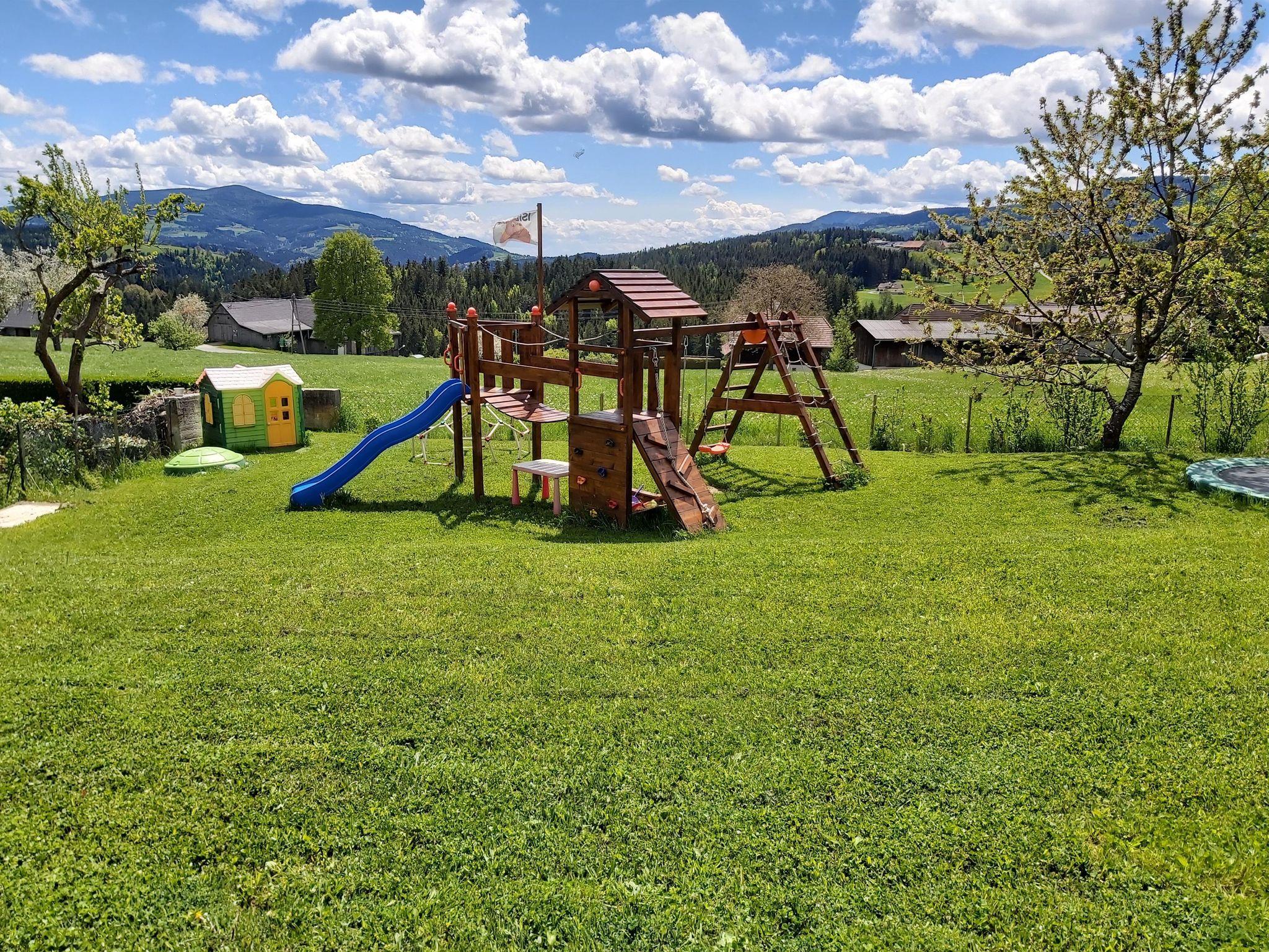 • Garten mit Kinderspielplatz: Trampolin, Spielturm, Kletterwand, Sandkasten, Schaukel, Rutsche, Spielhaus