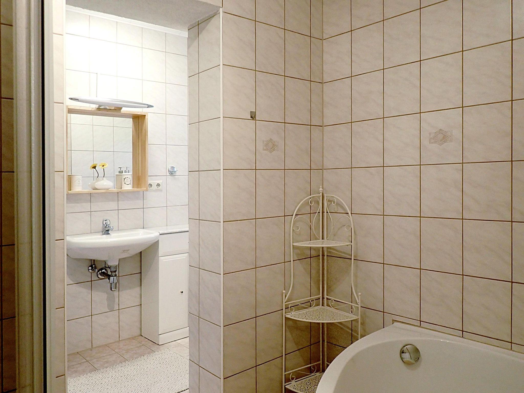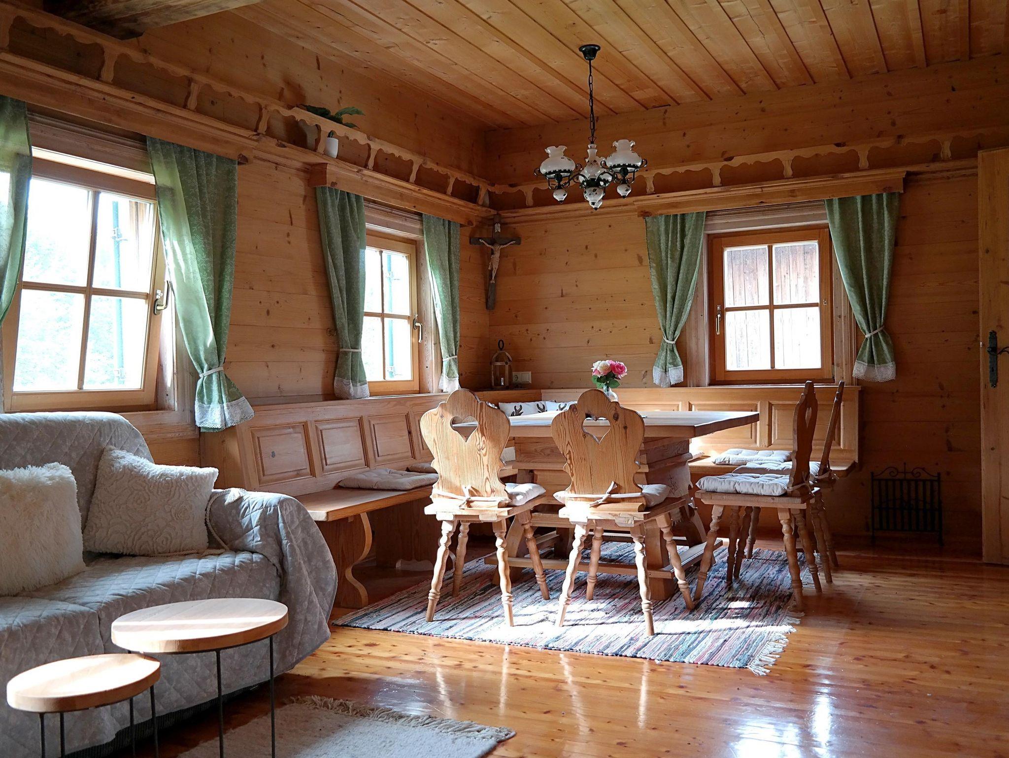 Die Wohnung nimmt den Raum der alten Rauchstube und der Labn, ein typischer Hausflur, ein und bietet eine große Stube mit Jogltisch und einem ausziehbaren Sofa, eine Küche mit Speisetisch und Eckbank, ein Schlafzimmer mit Doppelbett, ein Schlafzimmer mit Einzelbett, ein großes Bad mit Dusche und Badewanne und ein getrenntes WC.