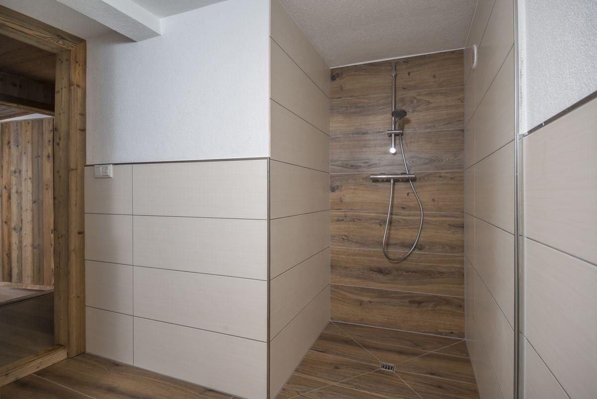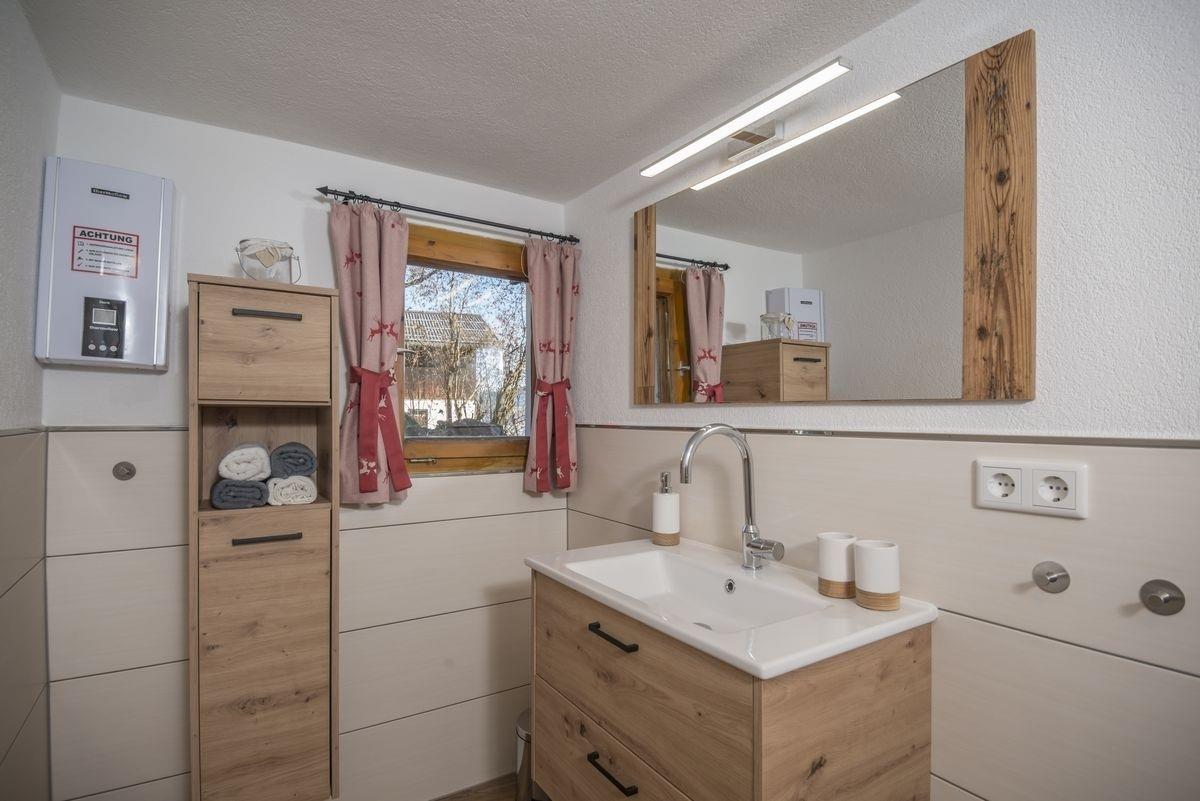 Badezimmer mit Dusche, Waschbecken & Fußbodenheizung