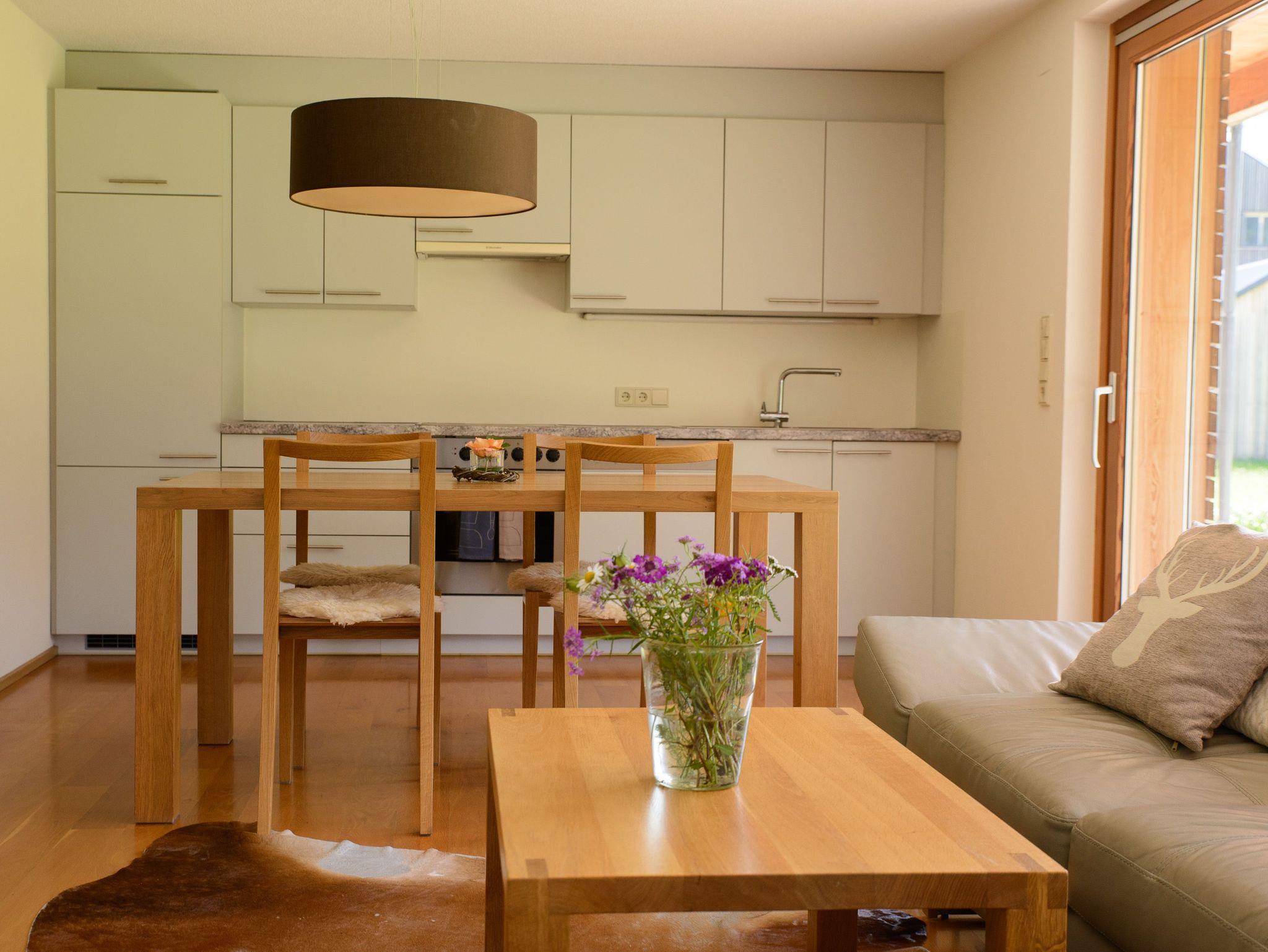 Wohnzimmer mit Couch und Essbereich - Küchenzeile mit Kühlschrank, Elektroherd, Geschirrspüler und Backrohr - 1 Schlafzimmer mit Doppelbett - Badezimmer mit Dusche, WC und Badewanne - Terrasse - TV - Kostenloser WLAN Zugang - Bettwäsche frisch für Sie bezogen - Handtücher - Geschirrtücher - komplettes Geschirr und Gläser sind vorhanden - Waschmaschine - Trockner - Fahrradabstellplatz - Schiaufbewahrungsraum - Liegestühle - pro Ferienwohnung ist ein Parkplatz vorhanden - Benützung von hauseigener Sauna, Schwimmbad und Whirlpool - Haustiere nicht erlaubt - Nichtraucherwohnung