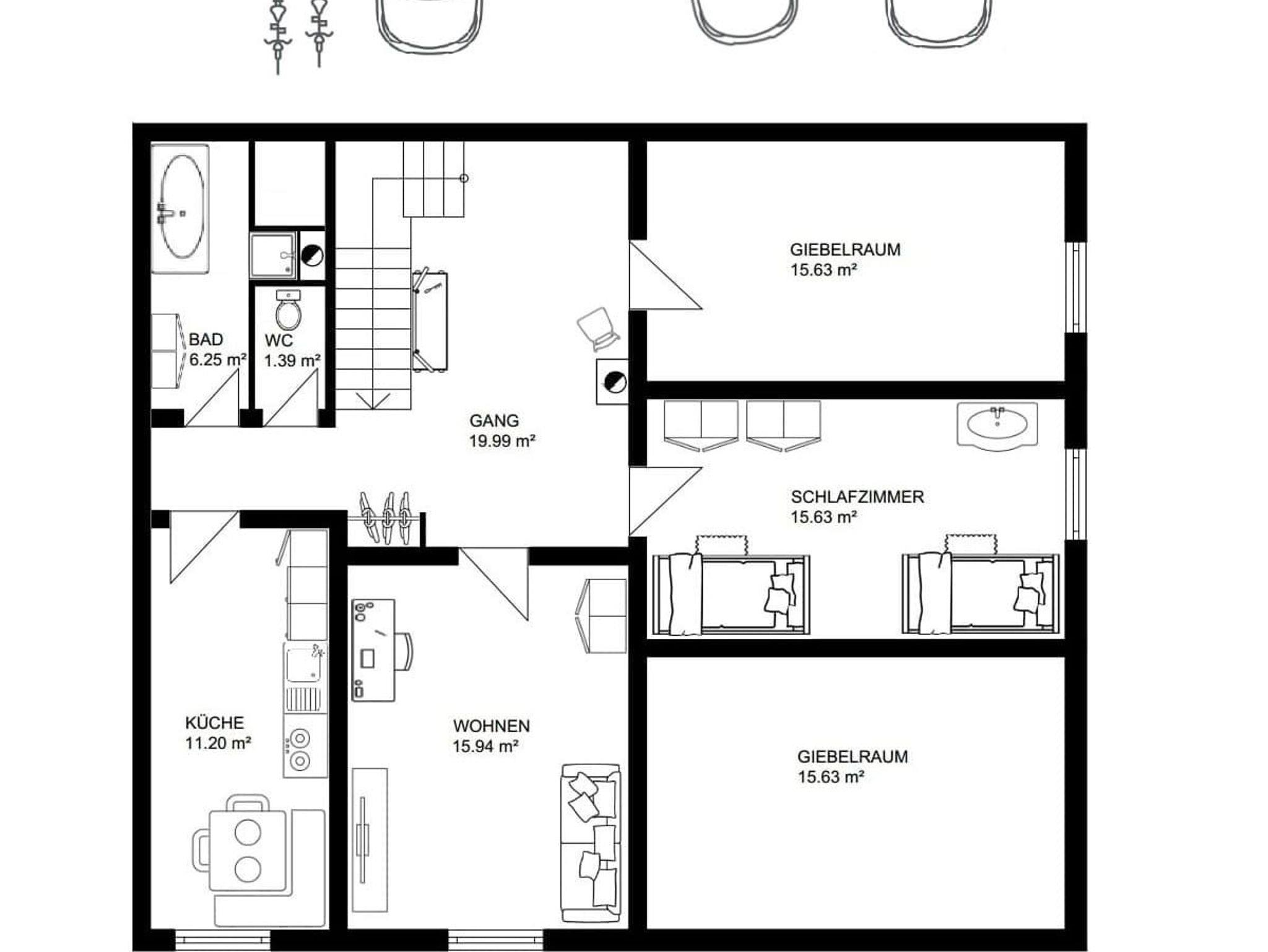 Das Ferienhaus besteht aus zwei Ferienwohnungen. Eine Ferienwohnung für bis zu 2 Personen, und eine großen Ferienwohnung im Obergeschoss für bis zu 8 Personen.