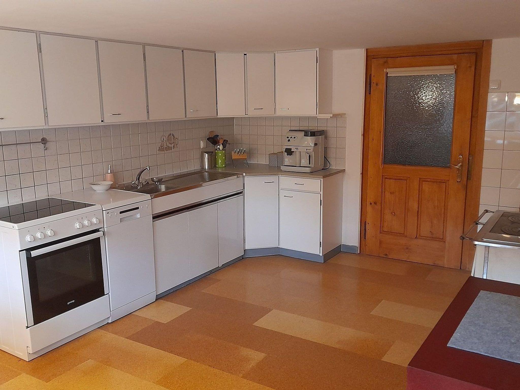 • Küche mit Eckbank, Esstisch, Kühlschrank, Elektroherd, Geschirrspüler und Backrohr