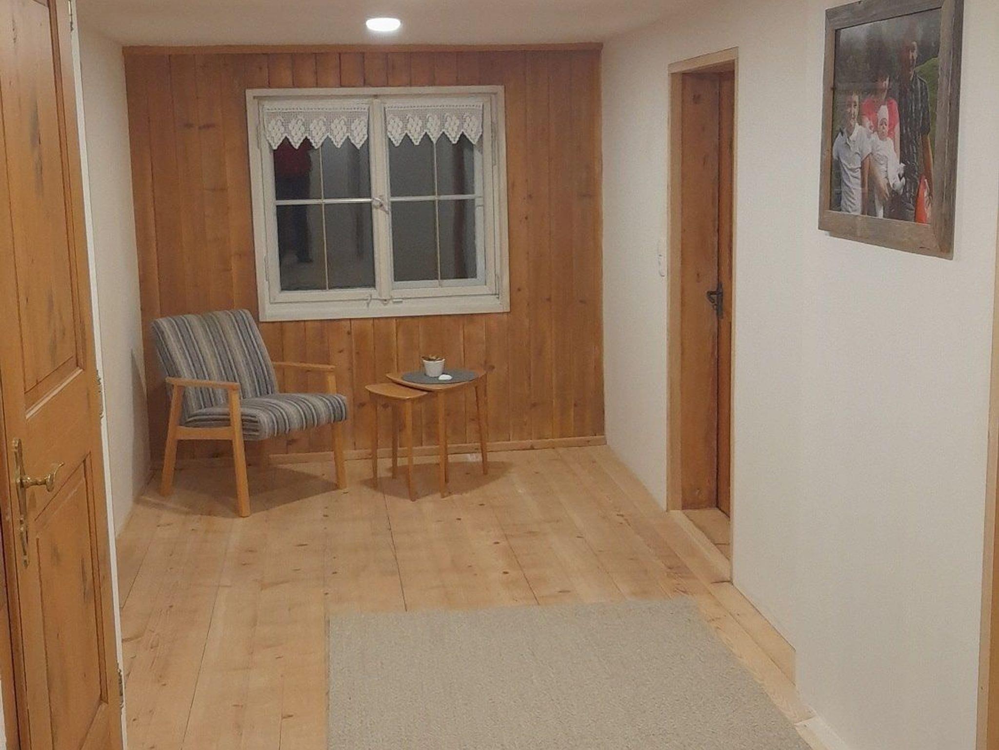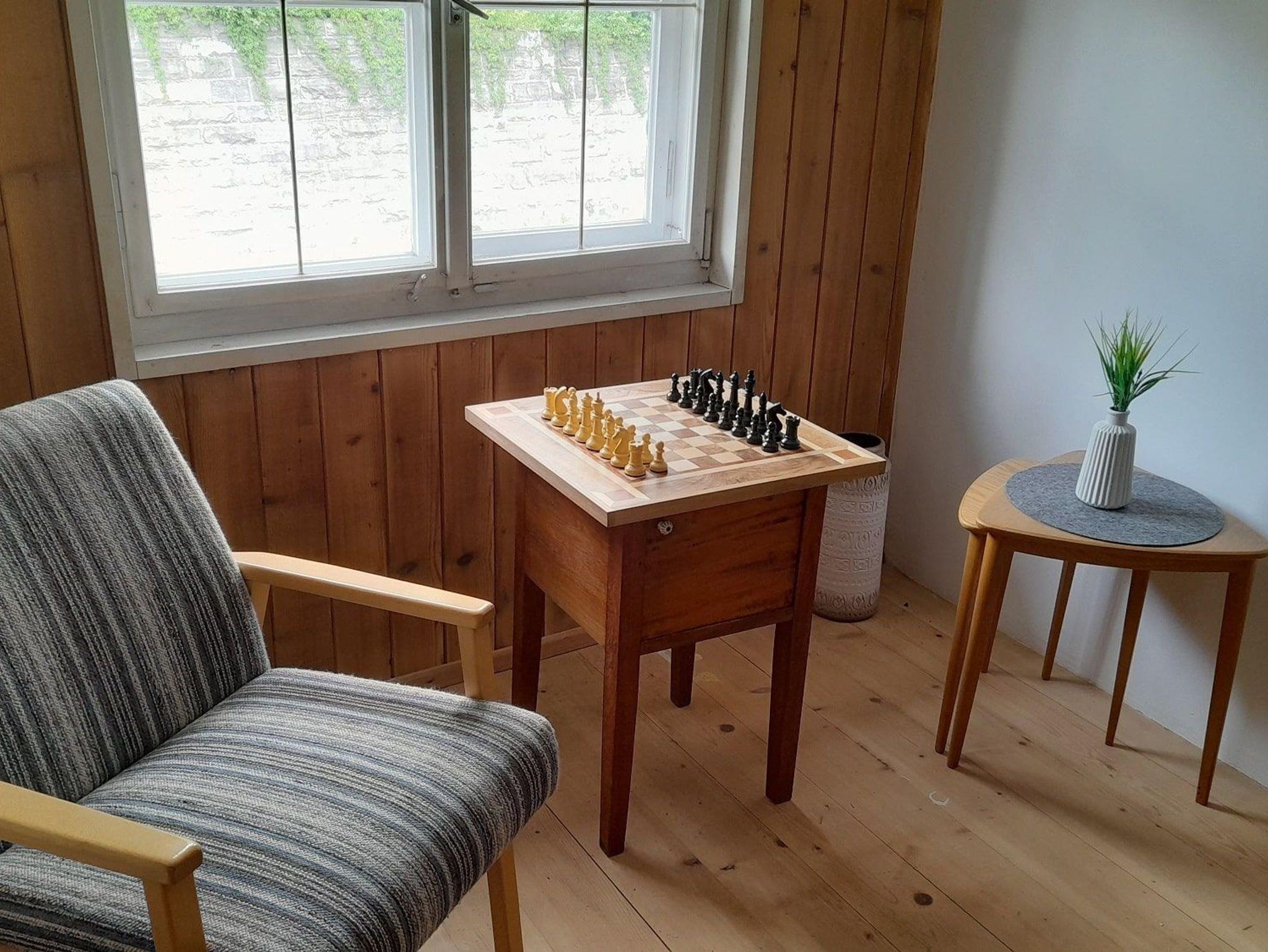 heller Flur mit Sitzecke und Schachtisch