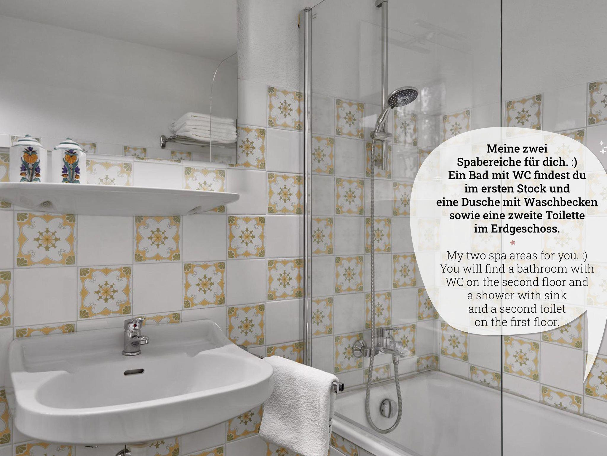 Ein Badezimmer mit Badewanne/Dusche, Waschbecken und WC im Obergeschoss, eine Dusche, ein WC, Waschbecken und Waschmaschine im Untergeschoss.