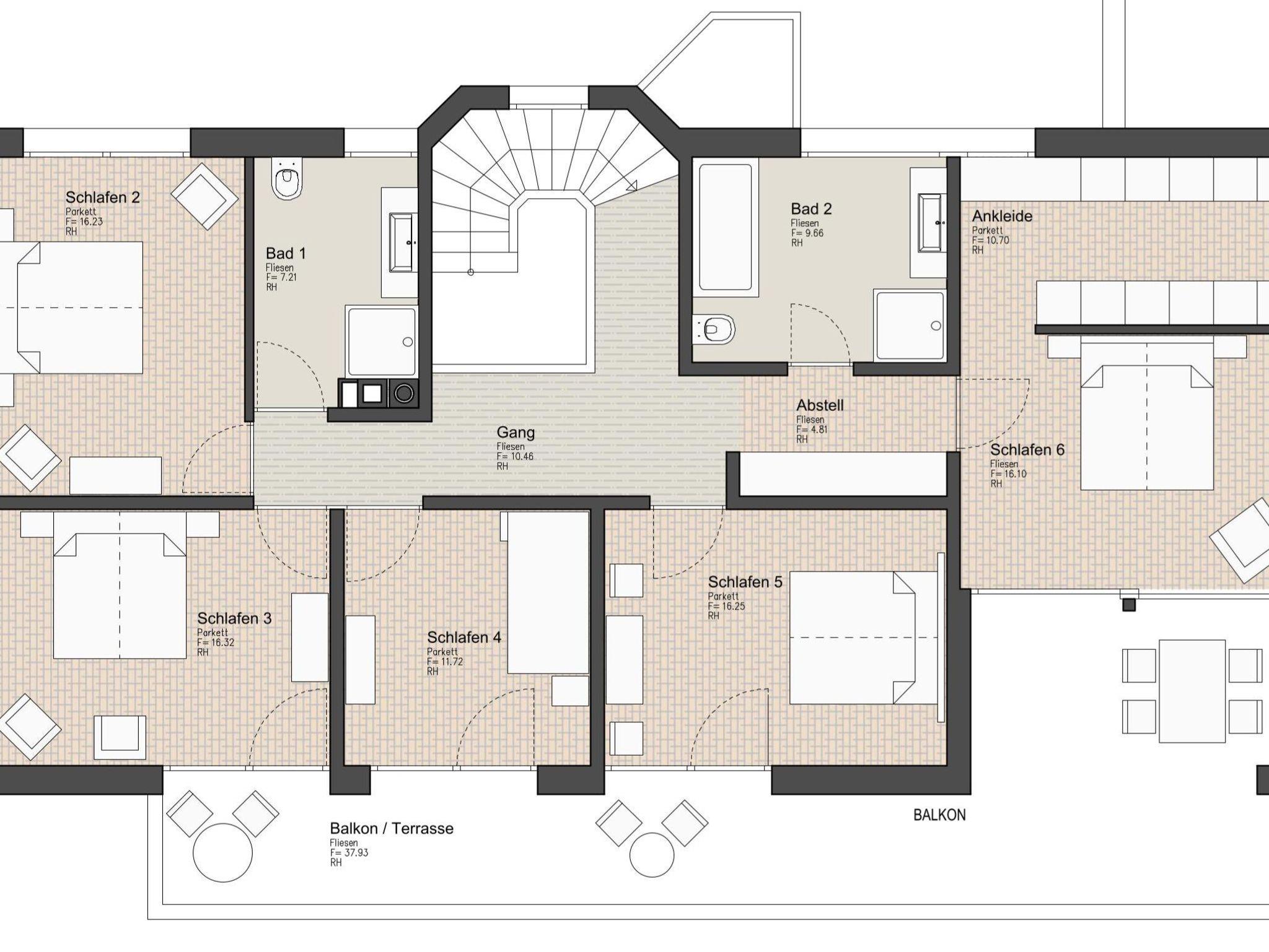 5 Doppelzimmer & 1 2er Zimmer mit Etagenbett. Weiters 2 Bäder und 2 separate WC.