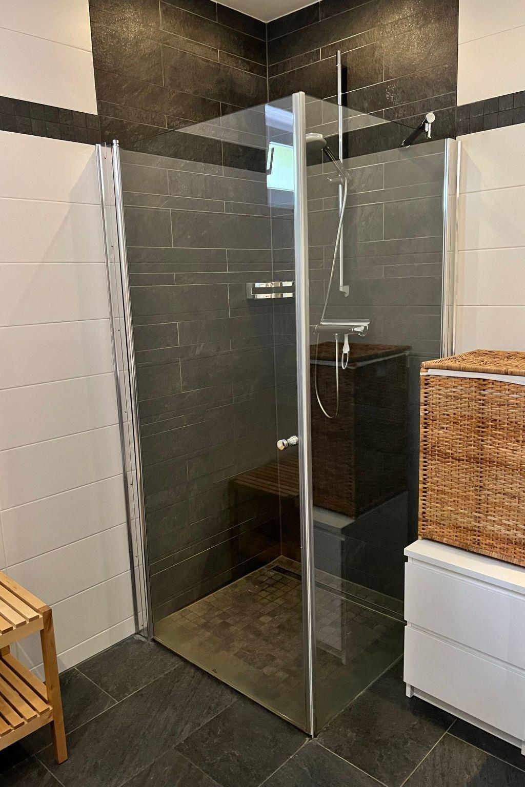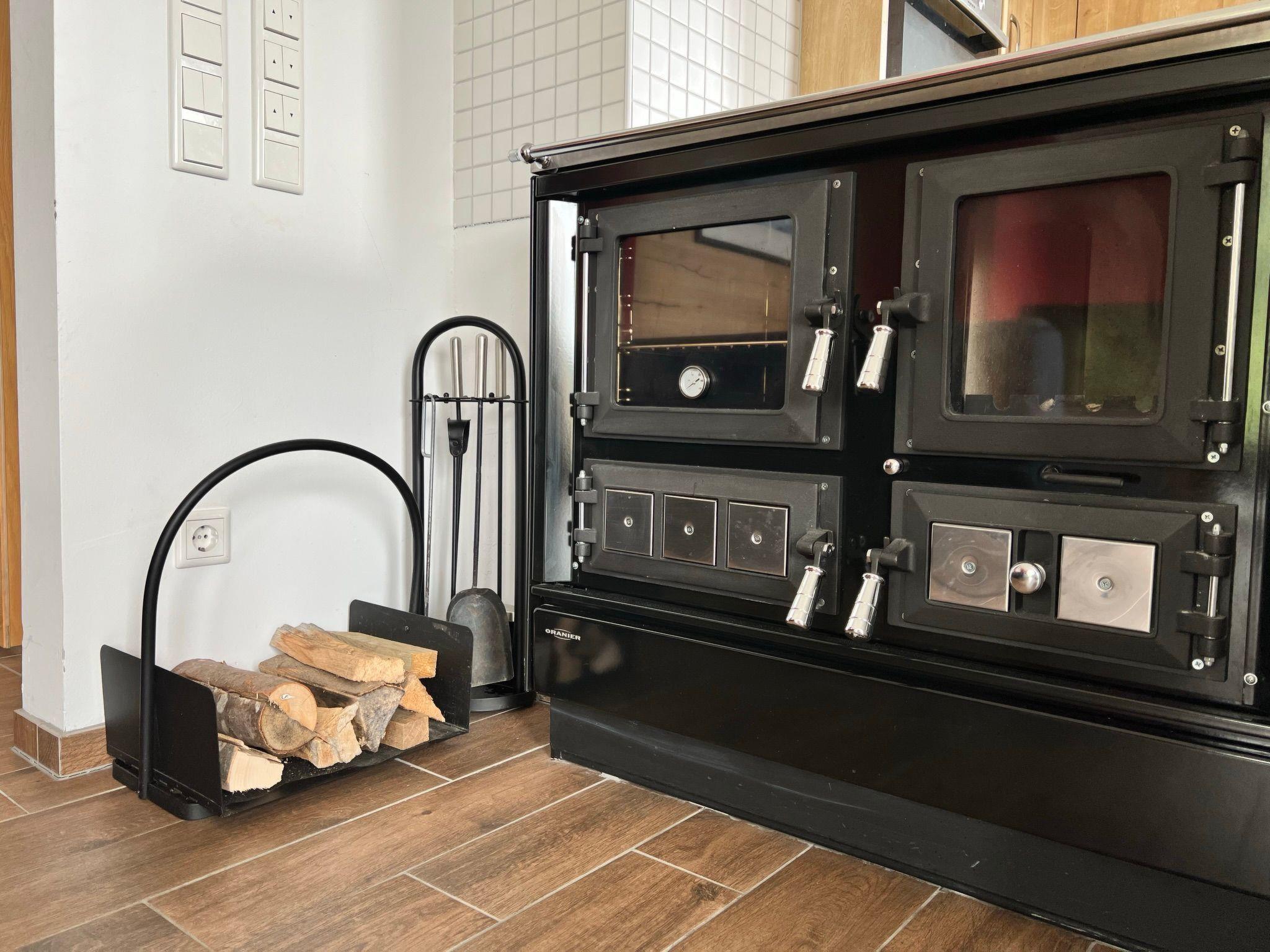 Its 135m² of living space for up to 8 people comprises three bedrooms, an open living room with a kitchen, two bathrooms and a guest WC. The three bedrooms are each furnished with a double bed (180 x 200cm), and one bedroom also has a pull-out double bed (180 x 200cm). The open living room provides a TV, a sofa and further seating. The fireplace stove with a glass front is available for use. The required firewood is provided free of charge. The living room also includes a cooking island equipped with an induction hob, an oven, a microwave, a fridge, a freezer, a dishwasher, a smoothie maker, high-quality cookware and tableware, and a capsules coffee machine. One bathroom has a toilet, shower, washbasin, washing machine and hairdryer, the other has a shower and a washbasin. The toilet is in the guest WC next to it. Each room has heating and underfloor heating, so the accommodation is also pleasant in winter.
