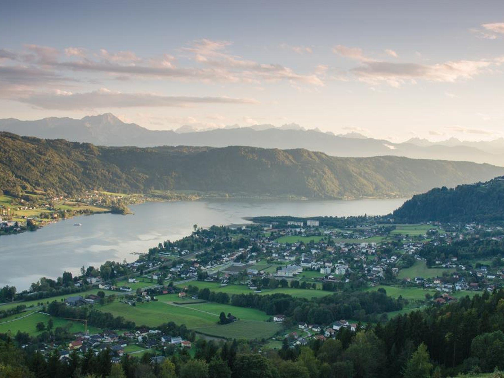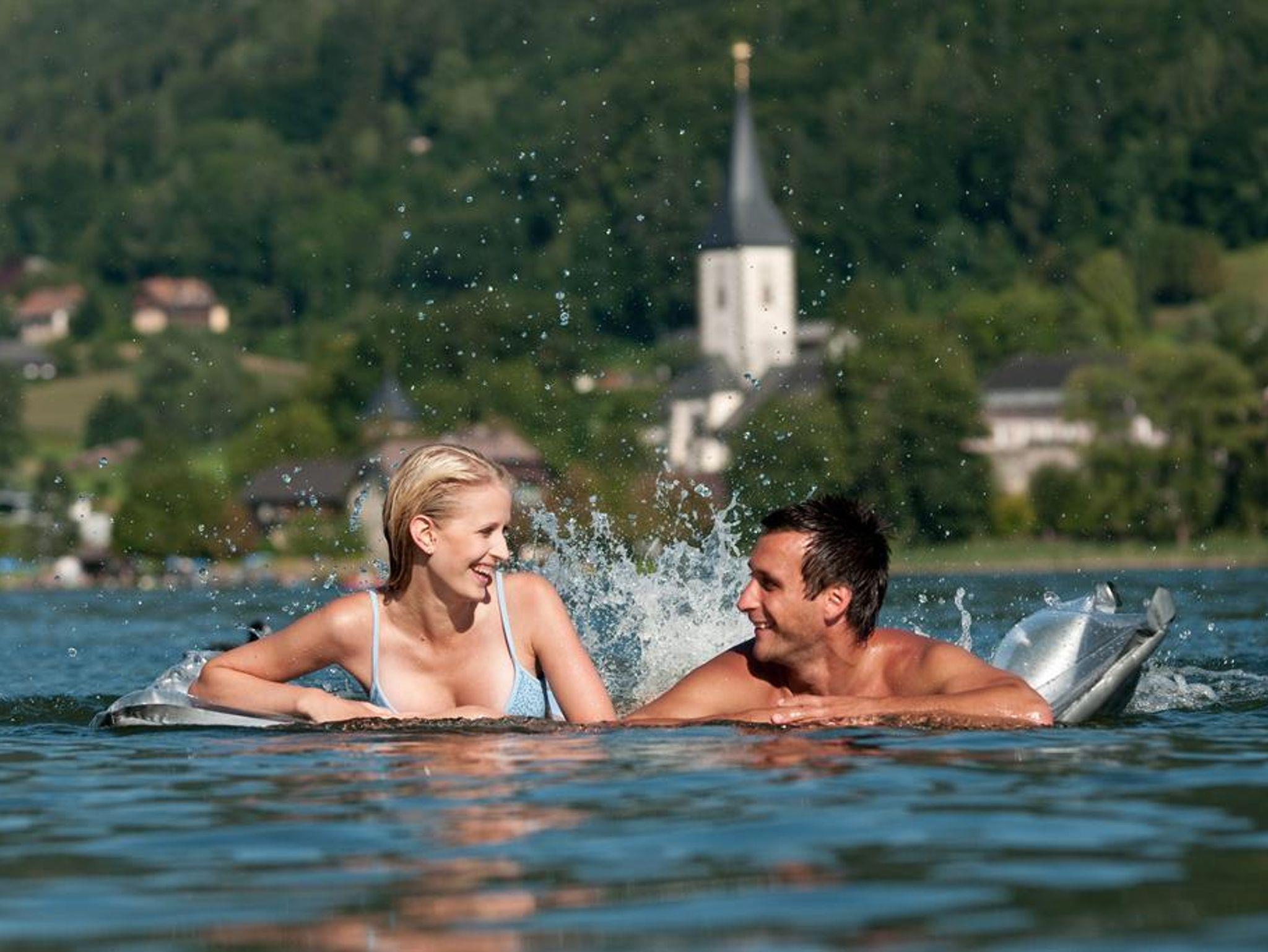 5 bis 10 Gehminuten zum See, kostenlose Strand- und Kabinenbenützung im Strandbad Bodensdorf.