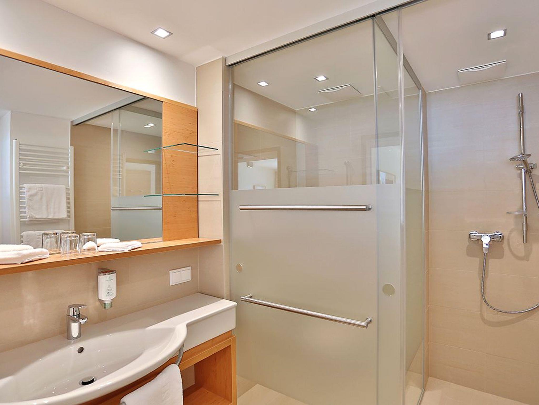 Doppelzimmer „Seeseite de luxe“ mit 34 m² Schlafzimmer mit seeseitig ausgerichteten Betten, Lümmelcouch (bei Buchungen als Dreibettzimmer als drittes Bett zu verwenden, Länge der Couch: 180 cm) und Lesestuhl. Seebalkon (im Erdgeschoss mit Gartenterrasse) mit traumhaftem Blick auf den See, Bad mit verglastem Duschbereich und WC, teilsatiniertes Fenster vom Bad in den Schlafraum, Sat-TV, Telefon und Glasfaser-WLAN.