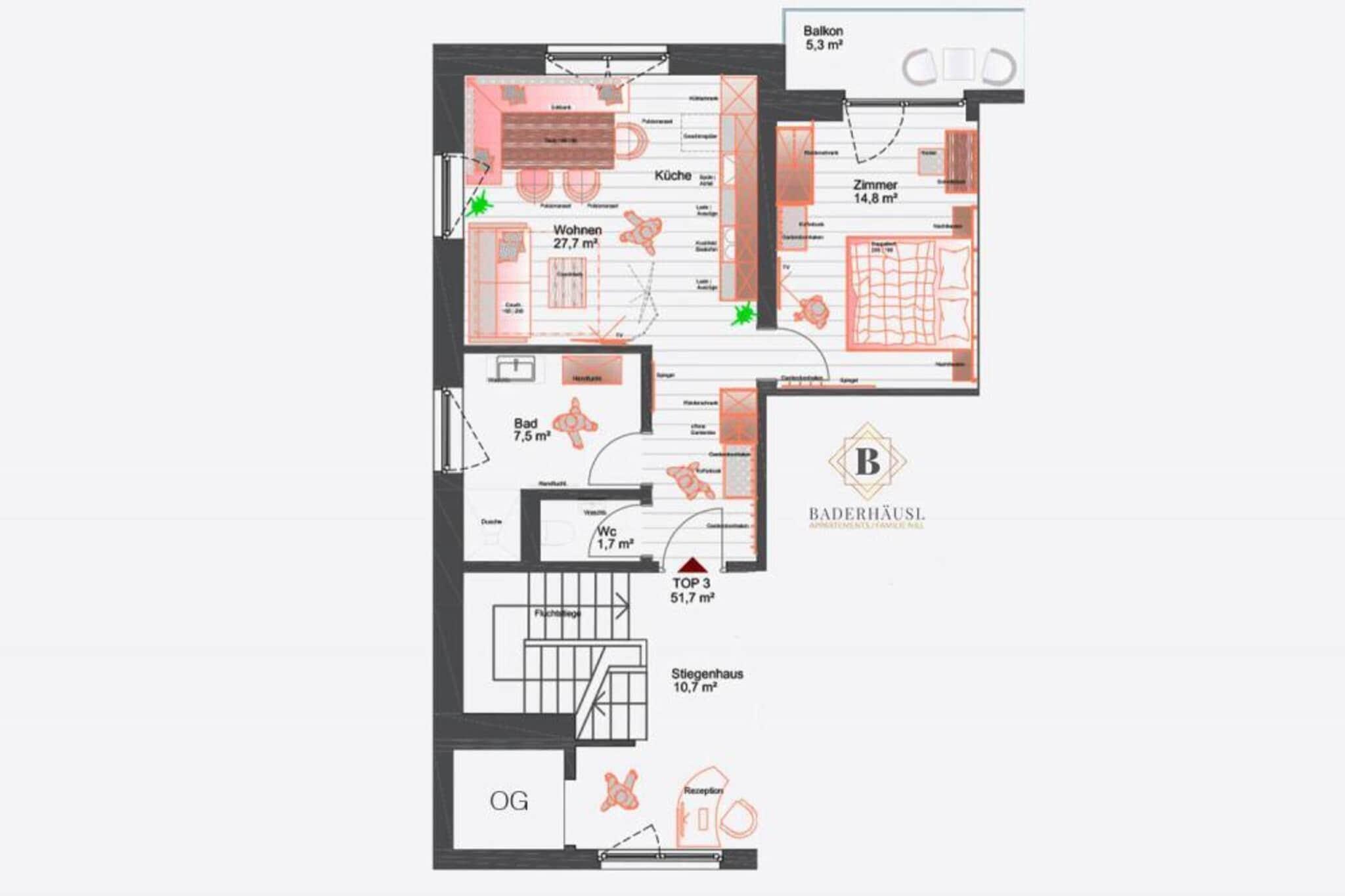 På 1. etage: (åbent køkken(kogeplade(Komfur med fire kogeplader, glaskeramisk), brødrister, kaffemaskine, mikrobølgeovn, opvaskemaskine , køle-fryseskab), stue / spisestue(dobbeltsovesofa, Fjernsyn(parabol, Tyske TV-kanaler)), soveværelse(dobbeltseng), soveværelse(dobbeltseng), badeværelse(badekar, bruser), badeværelse(badekar, bruser), toilet, balkon) have, havemøbler, grill
