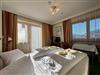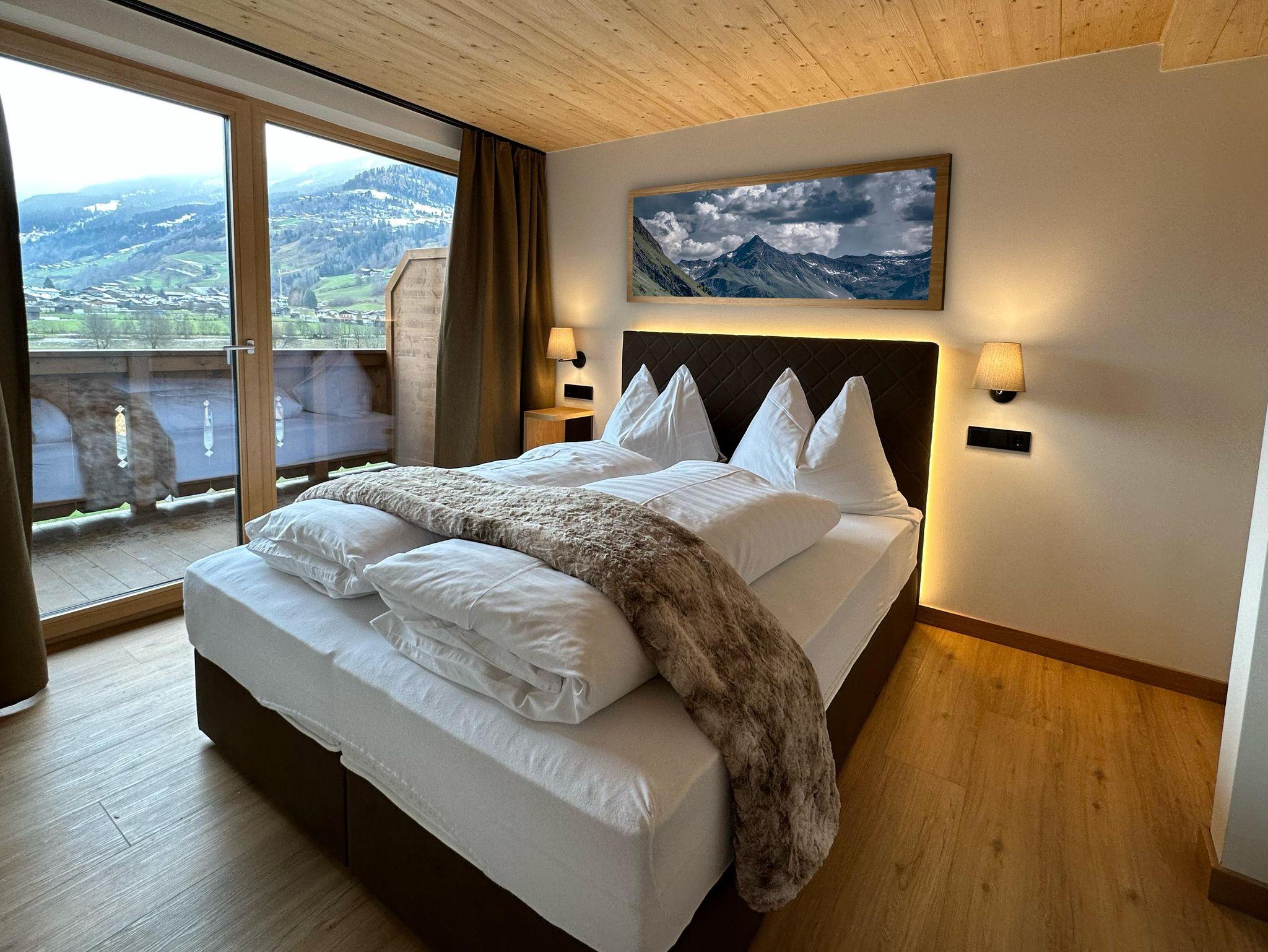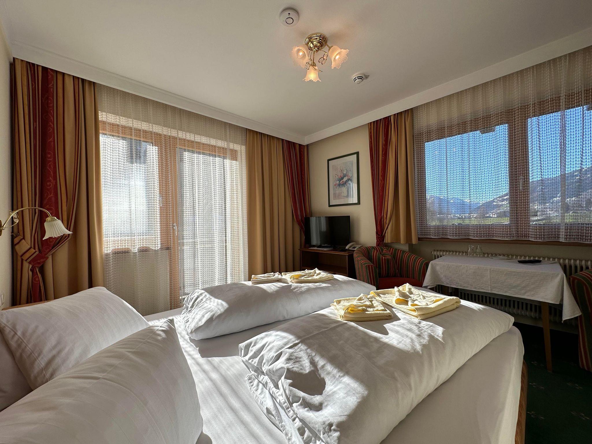 Familienzimmer mit 1 großem Doppelbett und zwei Sofabetten, Badezimmer mit großer Walk-in Regendusche,WC, Kabel-TV, Telefon, Haarfön und Balkon mit Blick auf die Berge
