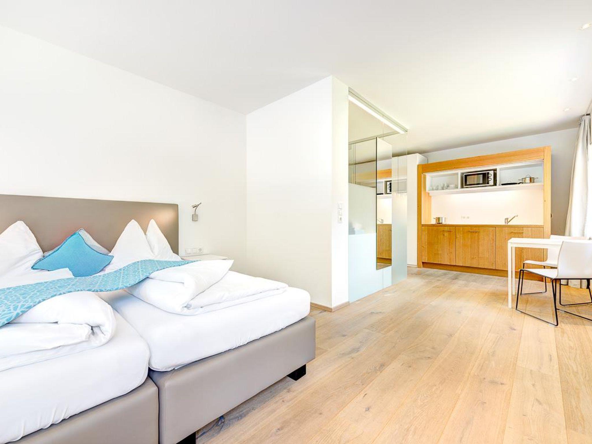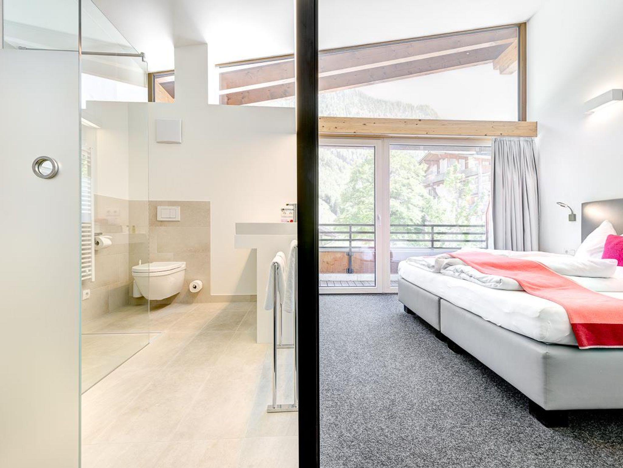 In diesem Zimmer können Sie die Sonne so lange genießen, bis sie hinter den Bergen des Brandertals untergeht. Durch die riesige Glasfront haben Sie auch vom Bett aus einen wunderbaren Blicke auf den Brandner Hausberg Mottakopf.