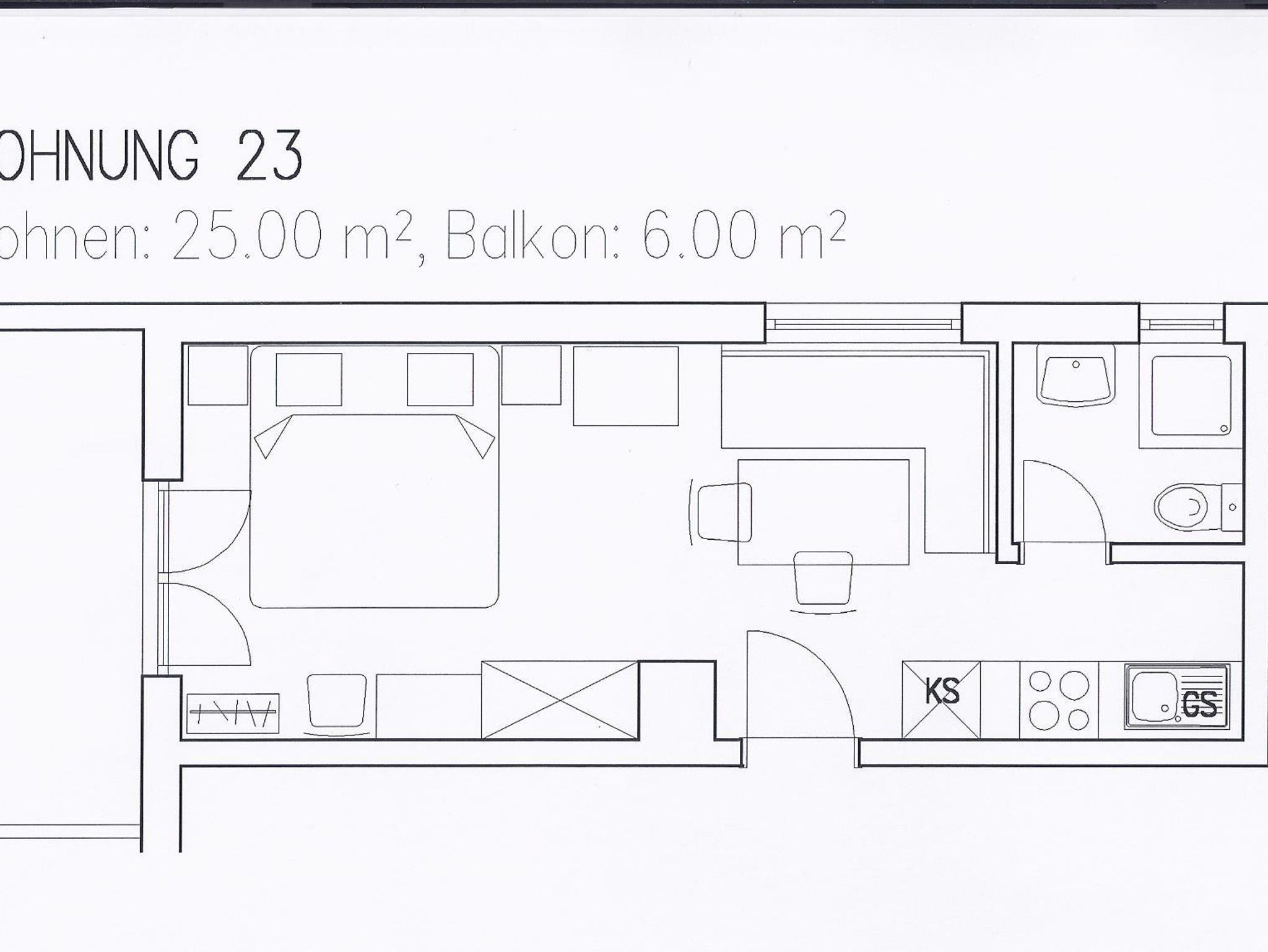 Appartement 23 mit Balkon ( 25m²) beinhaltet eine vollausgestattete Küche mit Geschirrspüler.