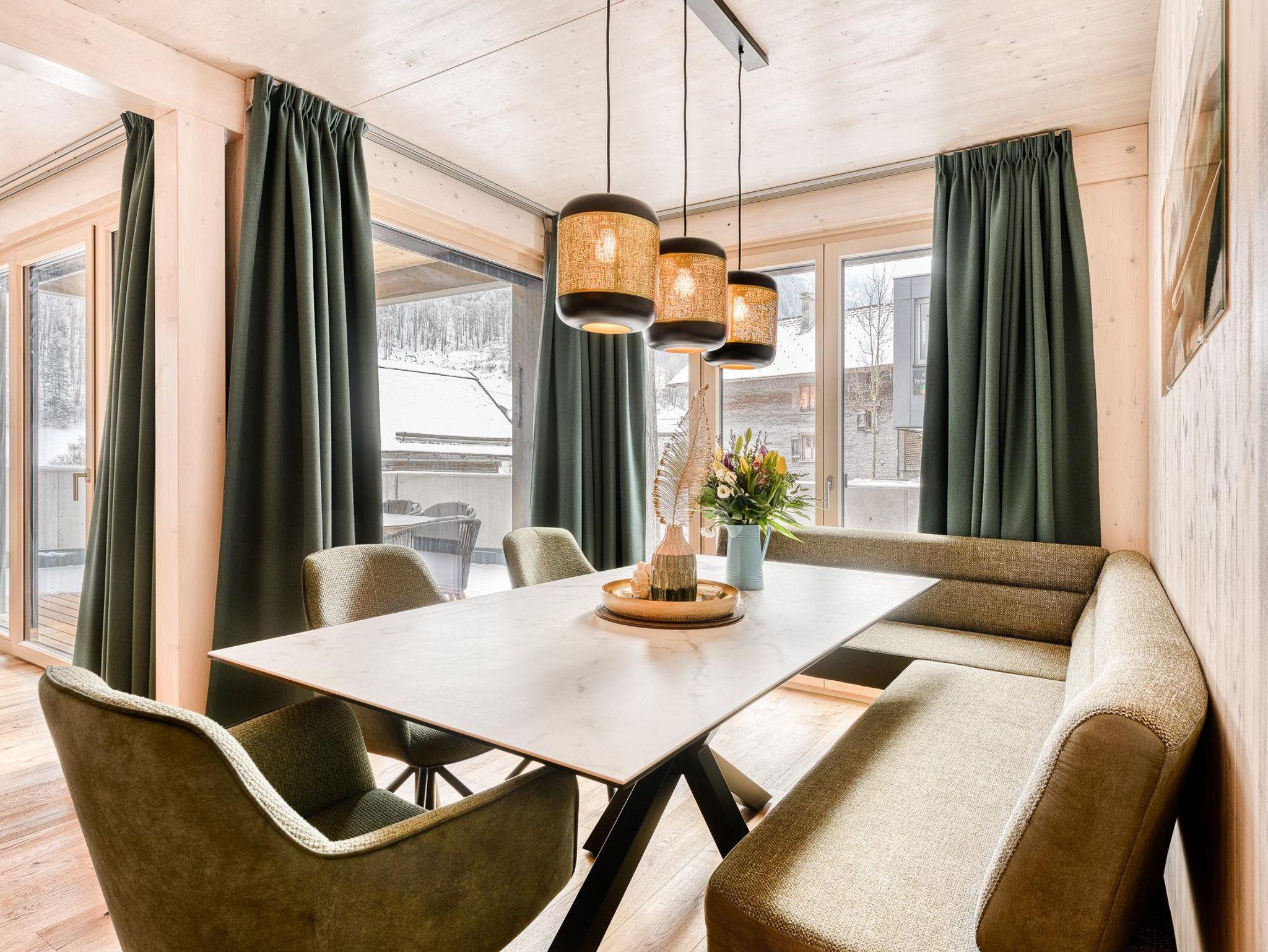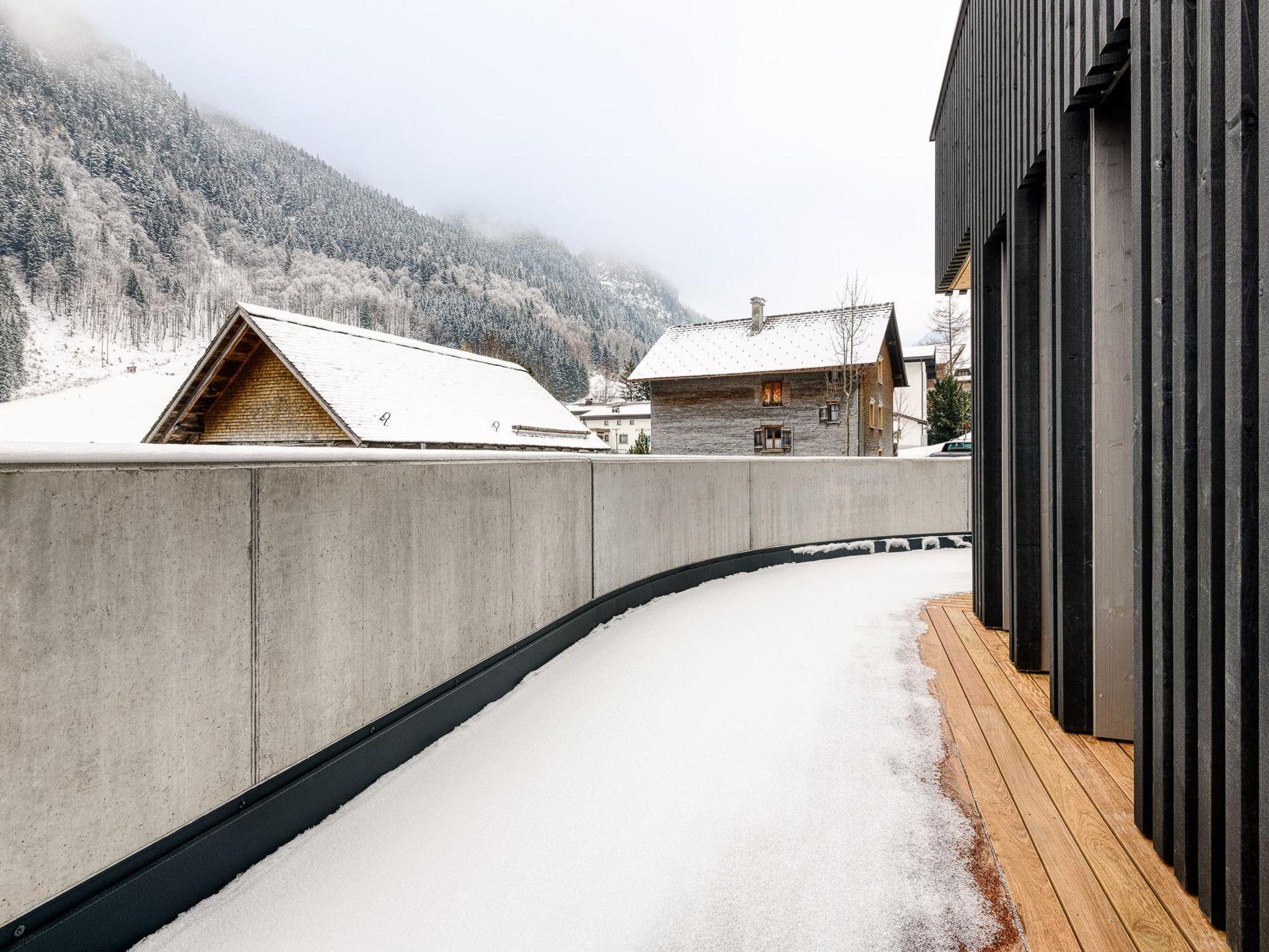 Die tiefe und sehr großzügige Terrasse ist in zwei Himmelsrichtungen ausgerichtet und garantiert am Morgen und am Nachmittag Sonne, so es die mächtigen Gipfel des Rätikons erlauben.