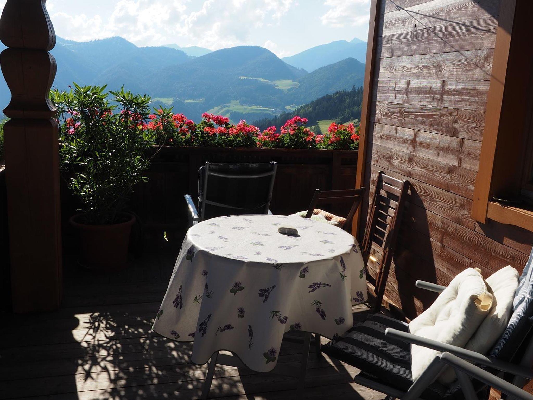 Die Ferienwohnung befindet sich im Obergeschoß und hat einen großen Süd-/ Westbalkon.