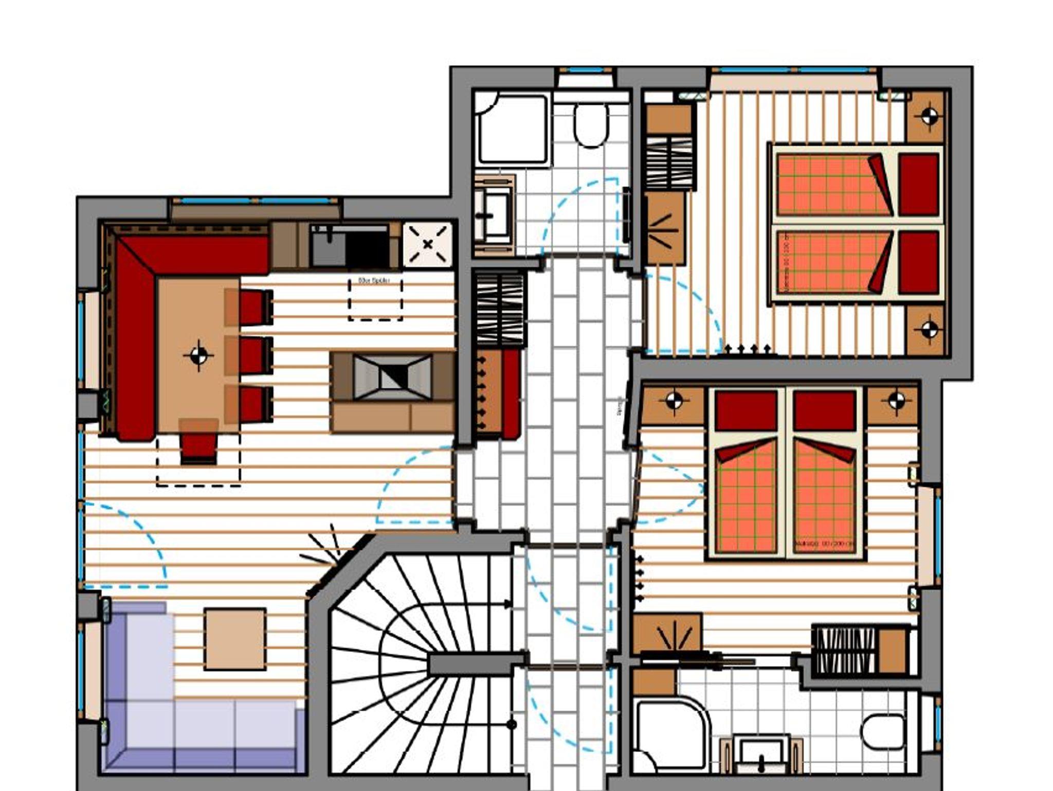 besteht aus 5 Schlafzimmern, 4 x Dusche/ WC, Wohn- Esszimmer mit TV und gut ausgestatteter Küche, Vorraum, Terrasse