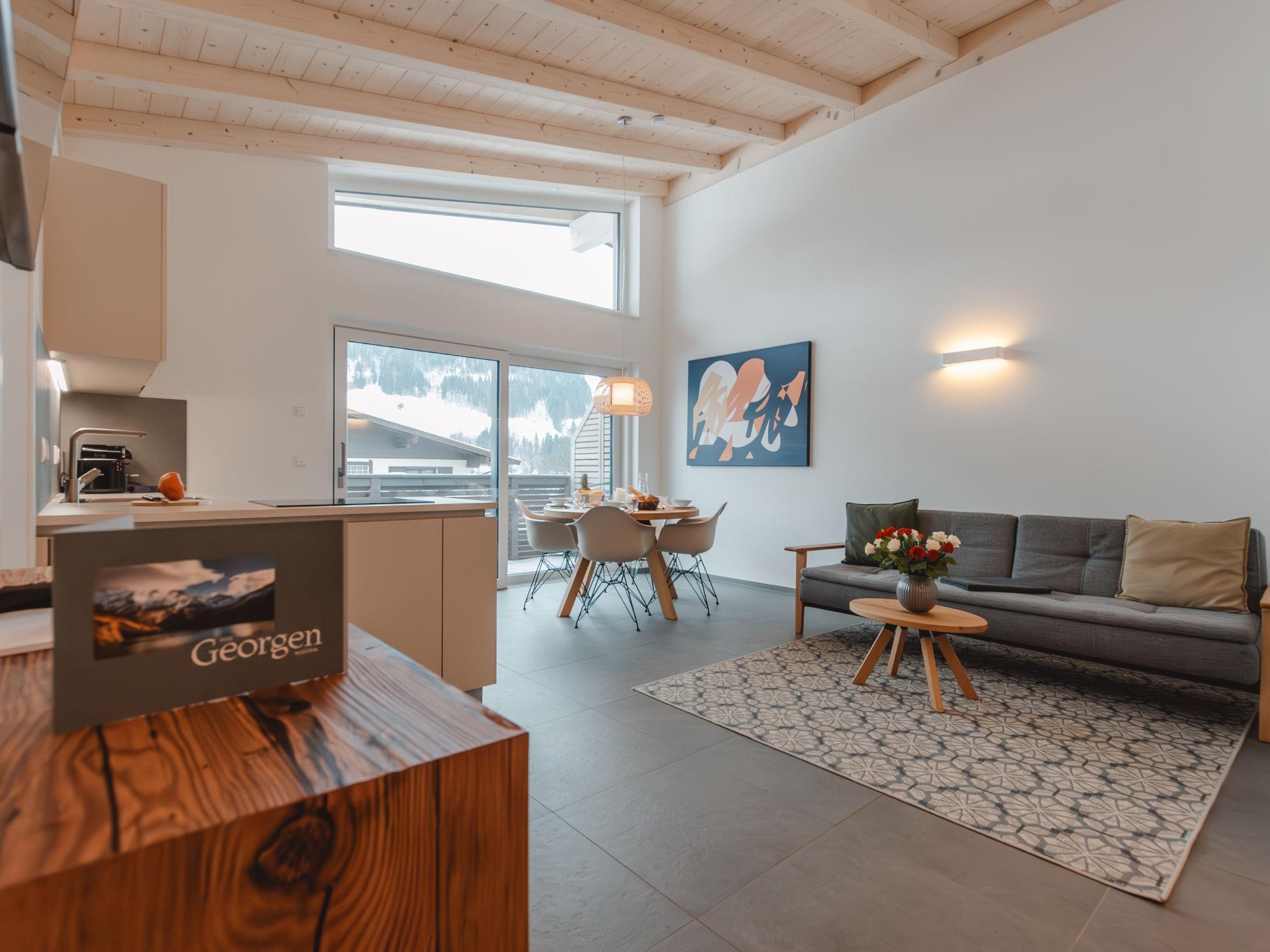 "Das Georgen, Kitzsteinhorn", 3-room apartment 62 m2 on 1st floor. Comfortable furnishings: living/sleeping room with 1 double sofabed and TV (flat screen). Exit to the balcony. 1 double bedroom. 1 room with 2 beds and TV (flat screen). Open kitchen (dishwasher, 4 ceramic glass hob hotplates, toaster, microwave, electric coffee machine) with dining table. Shower/WC, sep. WC. Underfloor heating. Balcony. Balcony furniture. Facilities: iron, baby cot. Internet (WiFi). Parking (roofed, 1 car). Please note: non-smokers only. 1 pet/ dog allowed. Smoke alarm. When there are less than the maximum number of guests staying at the property, not all of the housing units will be available for use. 50602-000341-2020