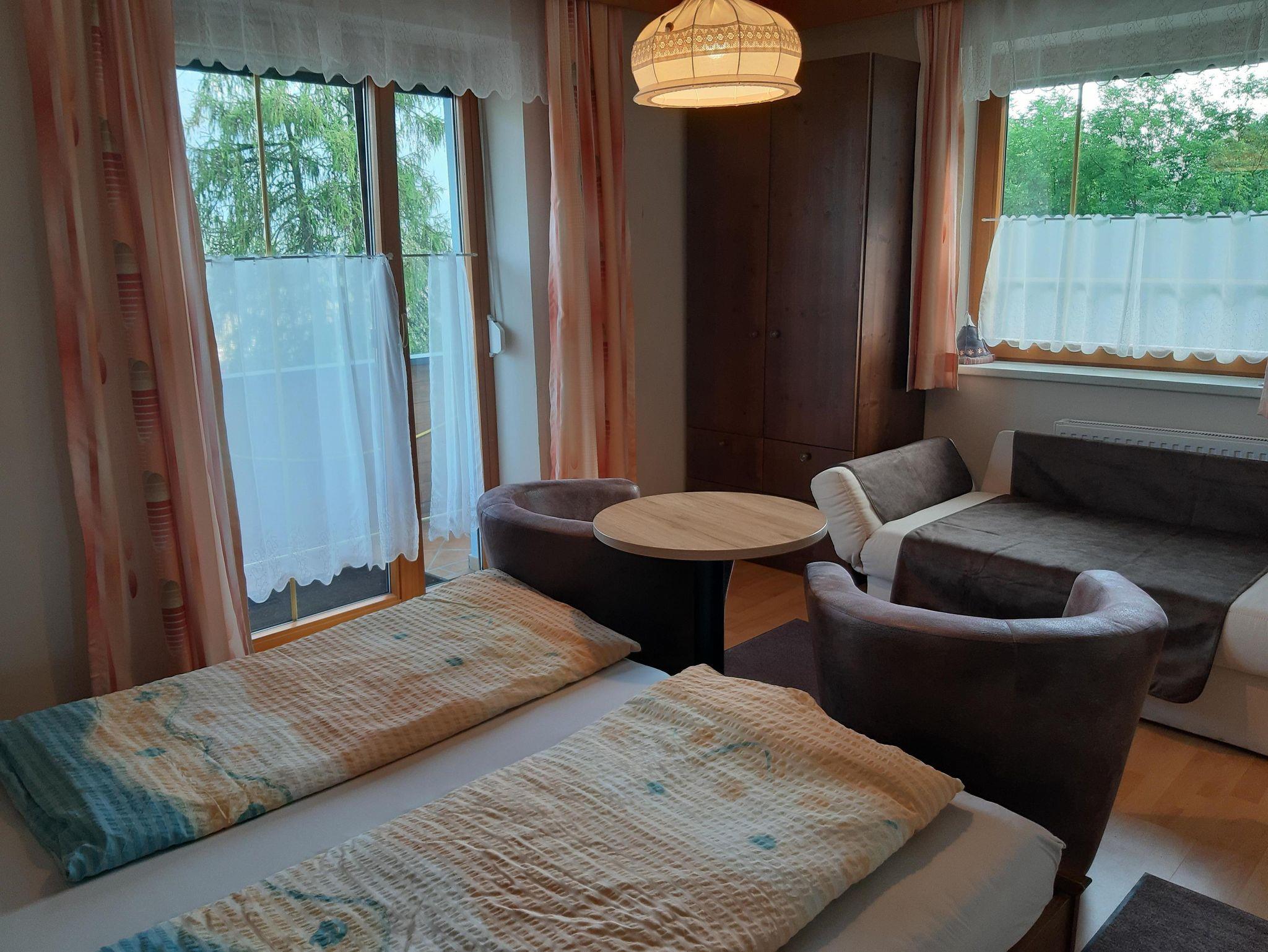 Dieses Zimmer verfügt über ein Doppelbett, einer Sitzgarnitur (Zusatzbett) sowie über einen nordwestseitigen Balkon inkl. Sitzgruppe.