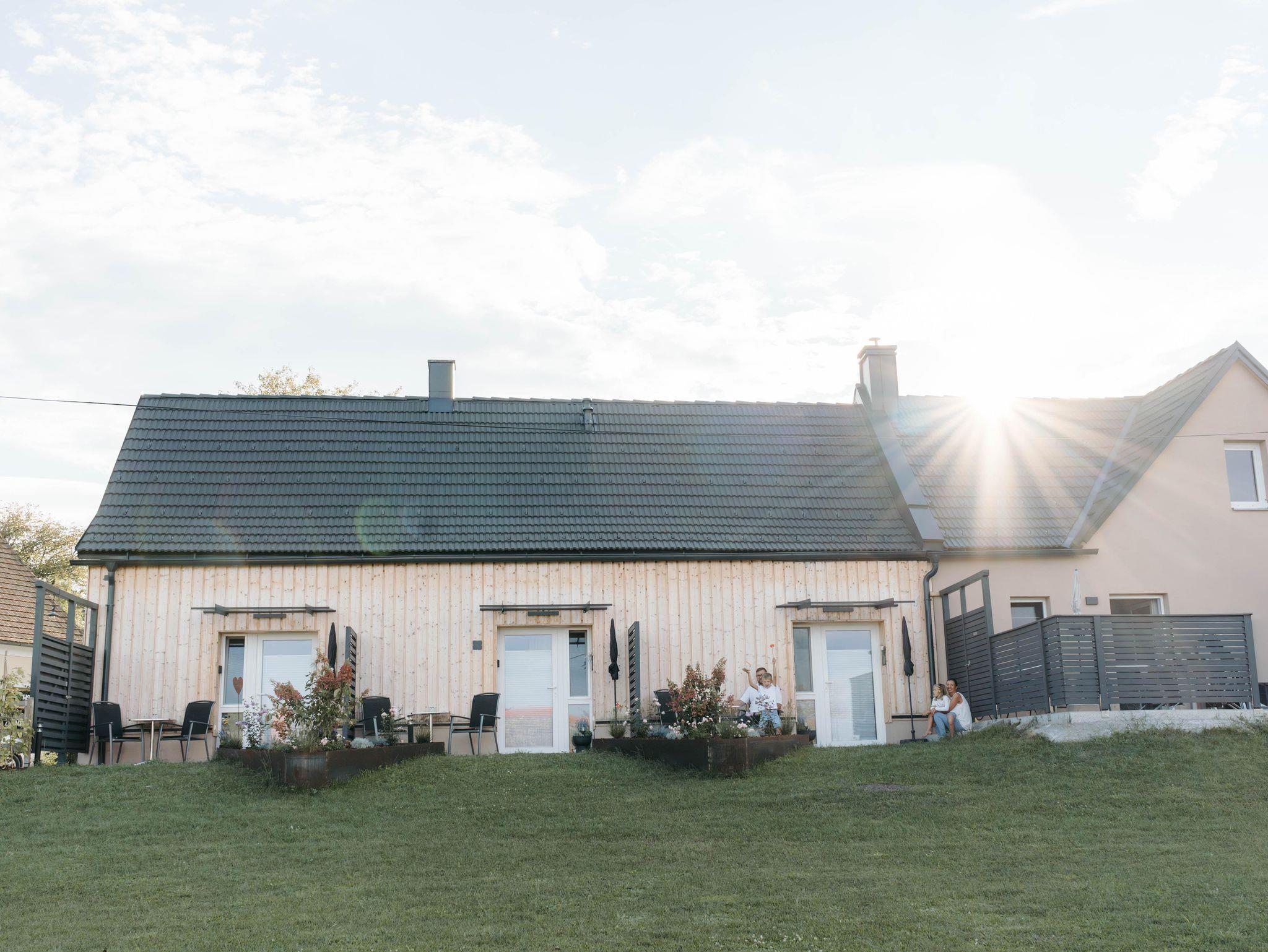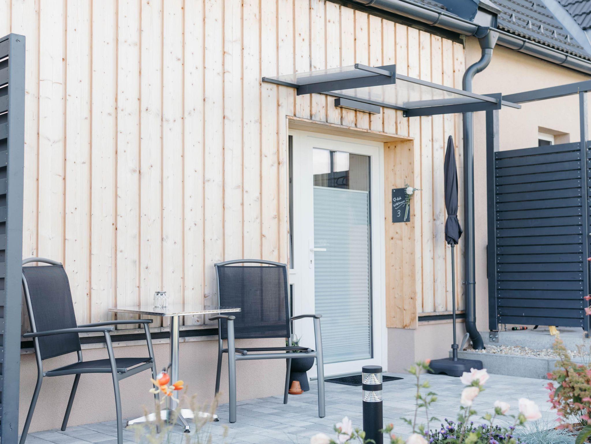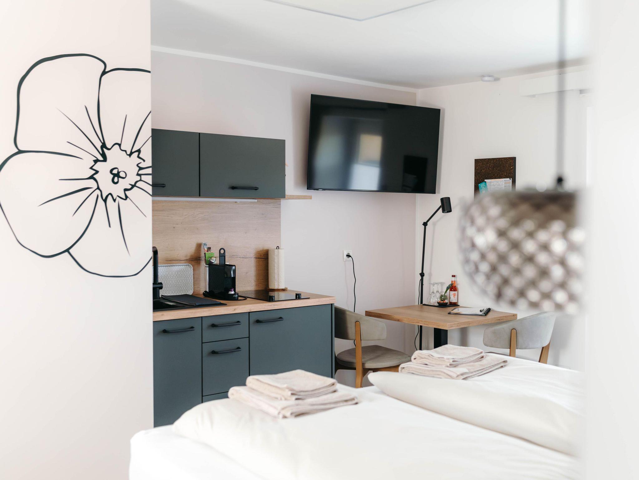 Eine kleine Küchenzeile mit einer Kaffeekapselmaschine, Essbereich, ein traumhaft gemütliches Boxspringbett mit 2 verschiedenen Härtegraden, ein kleines Badezimmer mit Dusche und WC, Fön, 50' Flat-TV, Zimmersafe, Minibar mit regionalen Getränken und Köstlichkeiten sowie ein eigener Eingang mit eigener Sitzmöglichkeit auf der überdachten Terrasse laden zu einem gemütlichen Urlaub bei uns ein.