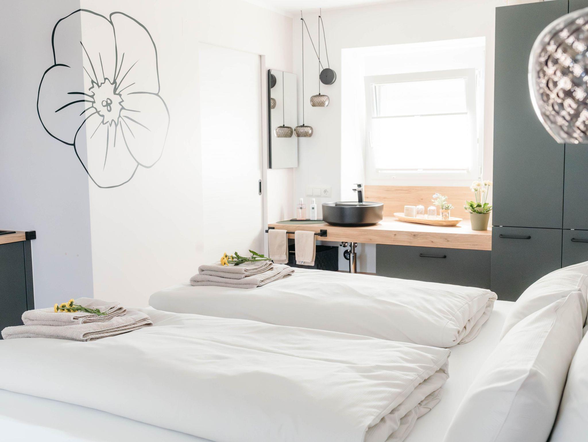 Die vollklimatisierten ebenerdigen Zimmer befinden sich in einem über 150 Jahren alten Haus welches von Grund auf saniert, topmodern und hochwertig ausgestattet wurde. Mit viel Liebe zum Detail und in den Farben der Blüten wurden die Zimmer gestaltet. Klein, kompakt und doch alles vorhanden.