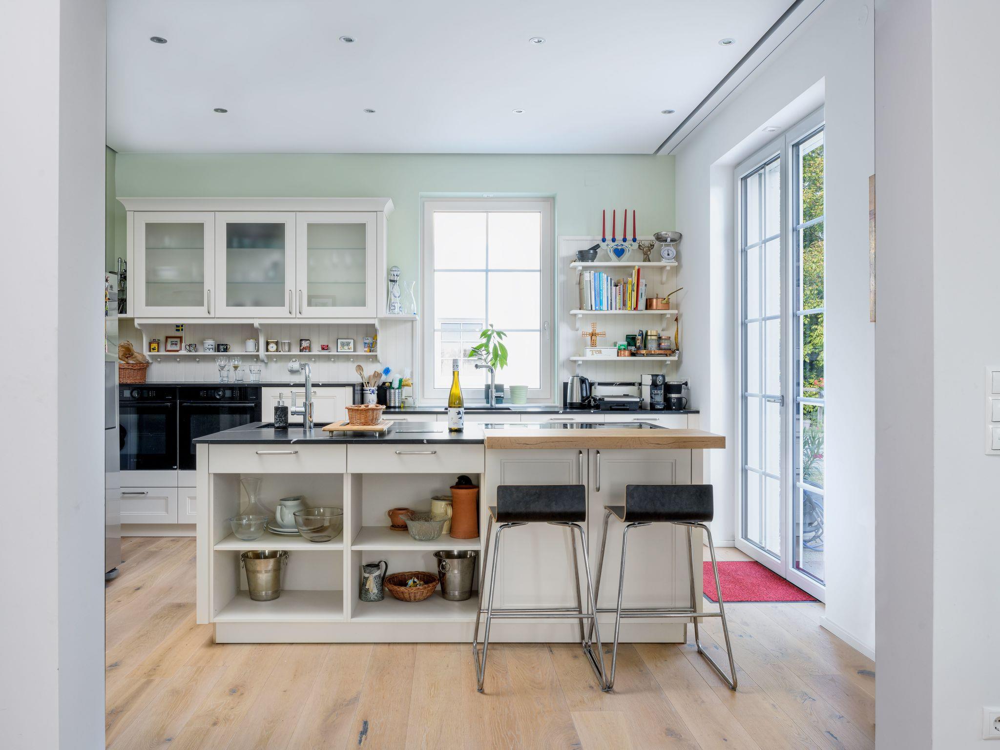 --A modern kitchen with cooking island, high-quality appliances (large fridge with ice cube dispenser, microwave, steam oven, toaster, coffee machine, raclette set) and everything you need for culinary delights.