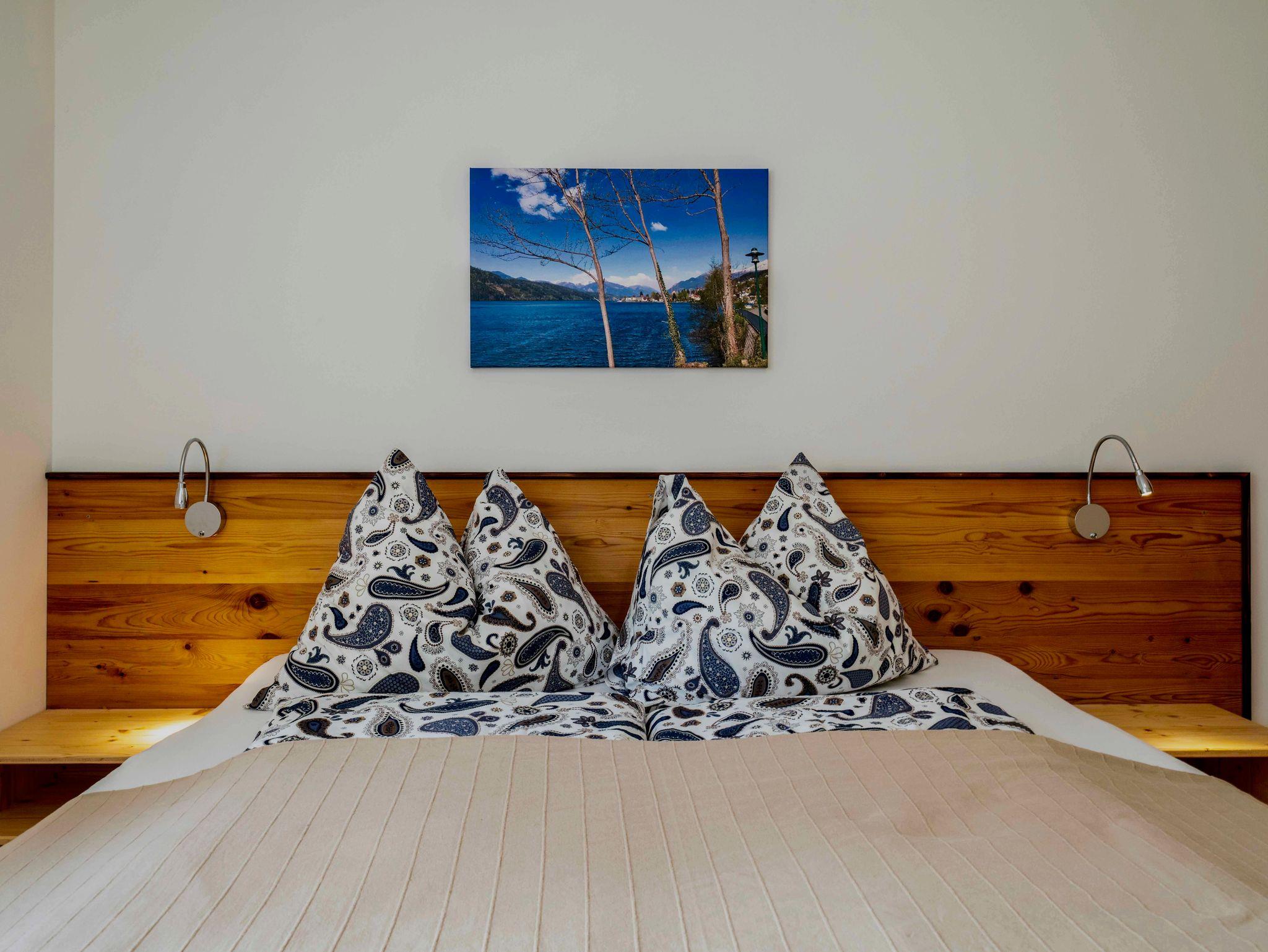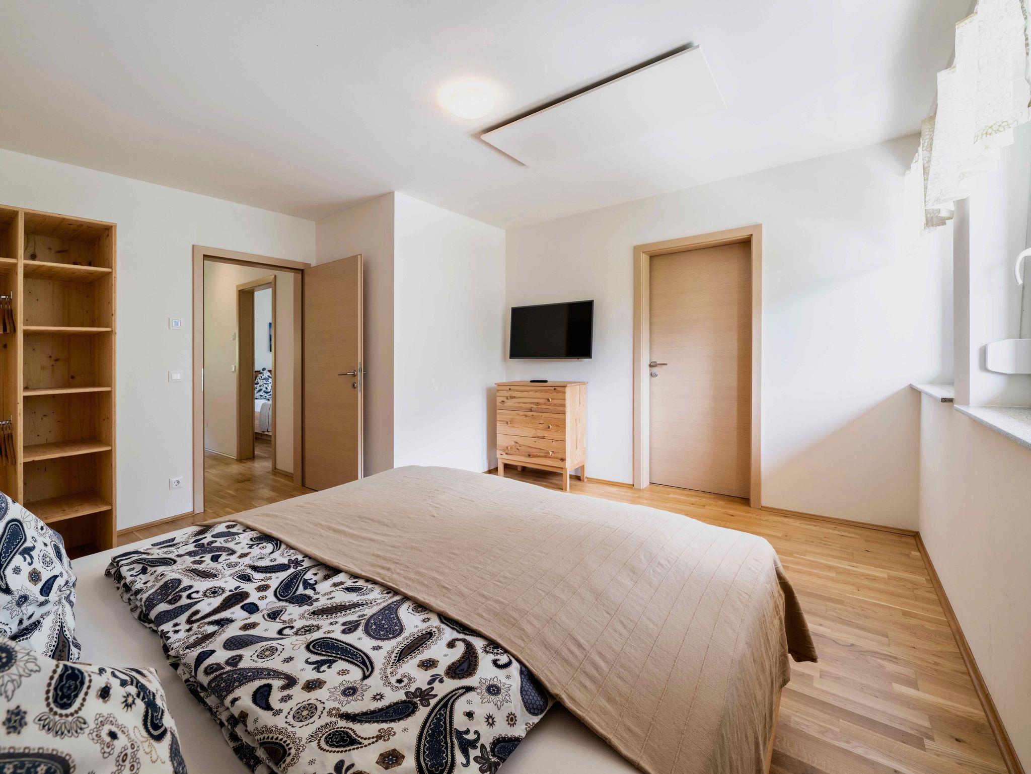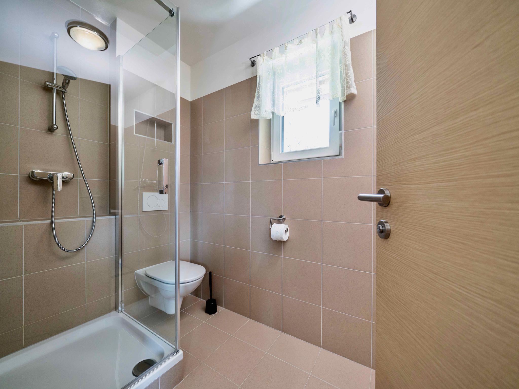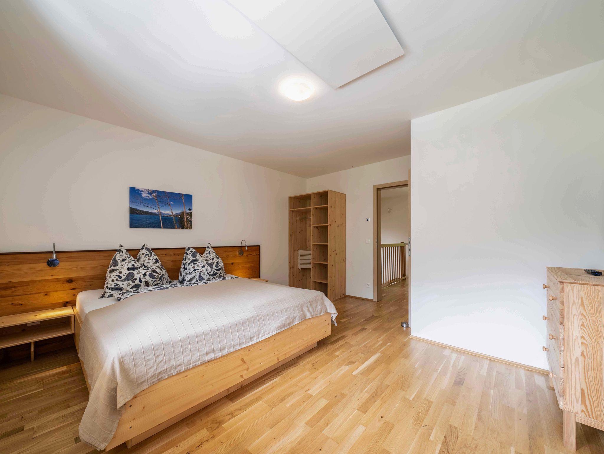 2 Schlafzimmer für 4 Personen mit jeweils eigenem WC/Badezimmer im OG. Die Wohnzimmercouch ist ebenfalls ein Doppelbett für weitere 2 Personen.