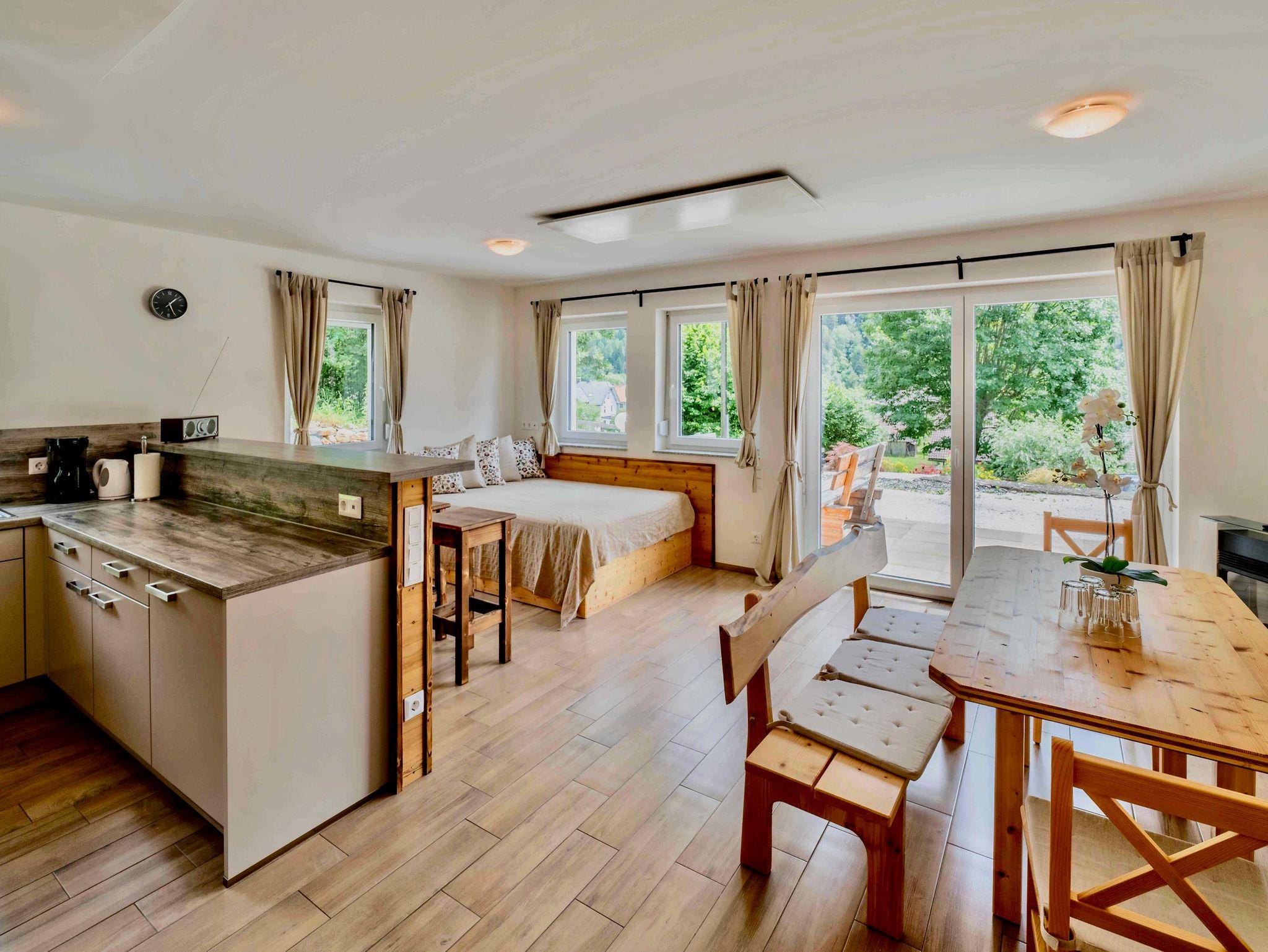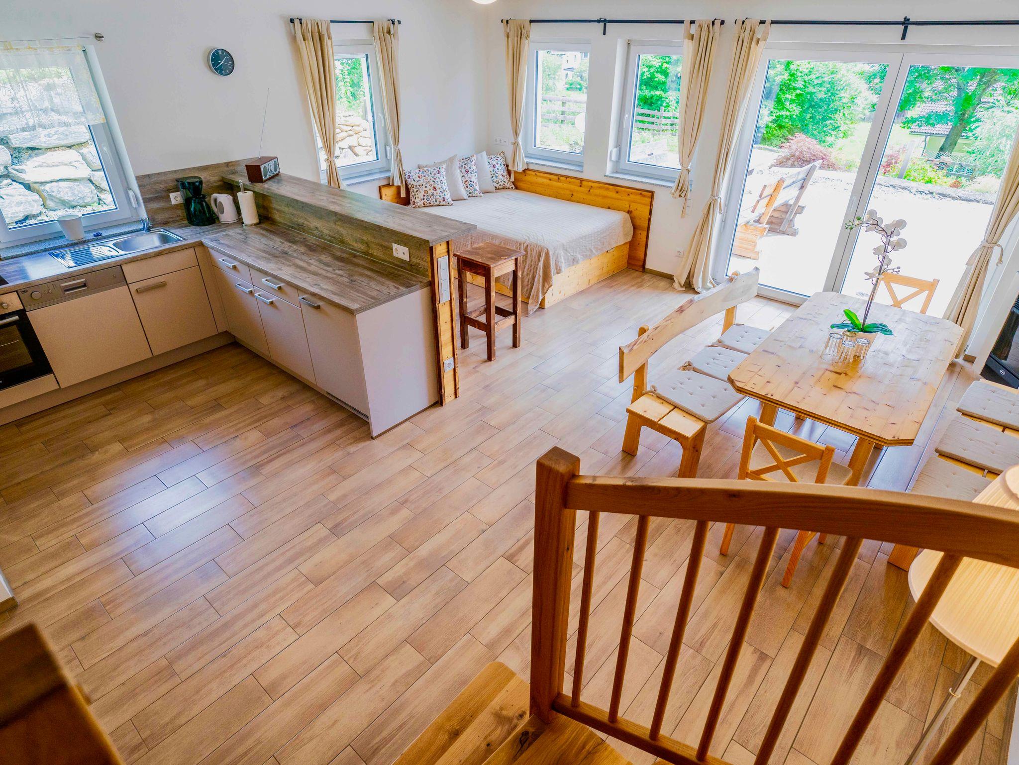 Geräumiger, gemütlicher Wohnraum mit integrierter Küche und Speiß im EG mit Sat-TV und Internet und Sonnenterrasse.