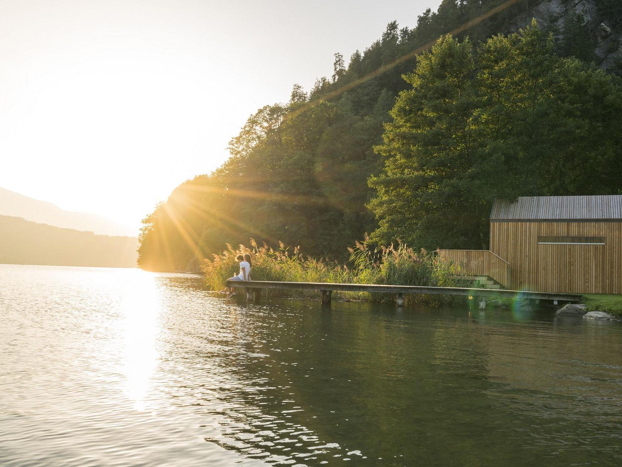 Durch die großzügigen Panoramafenster fällt der Blick abends auf die Sterne, morgens auf den Sonnenaufgang. Aus heimischem Lärchen-, Zirben und Fichtenholz gezimmert bietet das Biwak Platz für ein großes Bett, einen Tisch samt beschwingten Stühlen mit kuscheligem Lammfell sowie einen getrennt zugänglichen Waschraum mit WC und einer Waschschüssel aus Fluss-Stein. Mobilgeräte, Schlüssel und Terminkalender verstauen Sie in einem kleinen Fach, um die Zweisamkeit ganz ungestört zu erleben. Die Glasflügeltür öffnet sich zur Veranda hin, die zum Frühstücken Freien einlädt.
