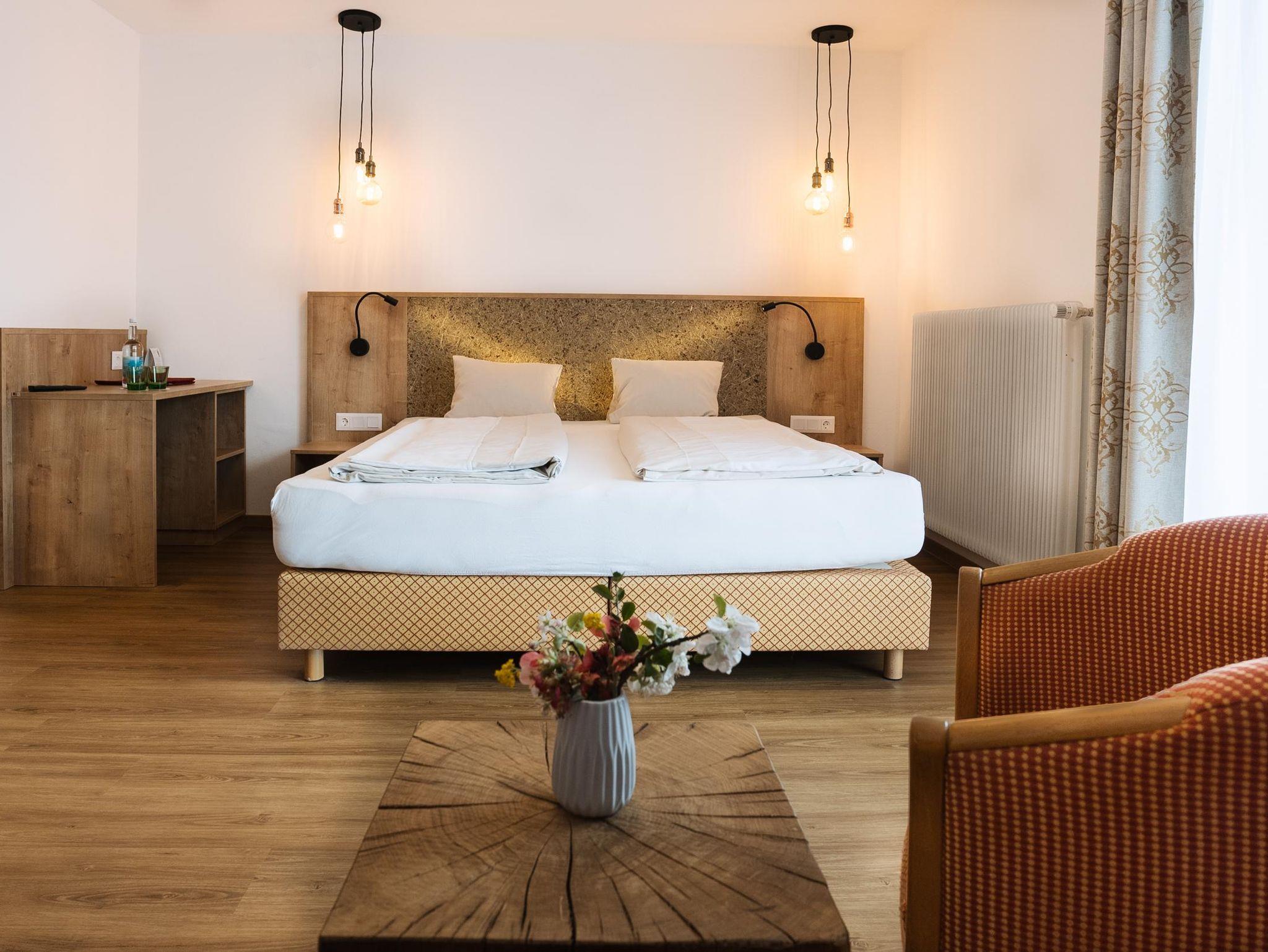 Das Doppelzimmer „Goldeck“ ist großzügig und komfortabel mit Sat-TV, Radio und Sitzgelegenheiten eingerichtet und bietet vom Balkon aus eine wunderschöne Sicht auf den Dorfbrunnen und den hoteleigenen Kastaniengarten.