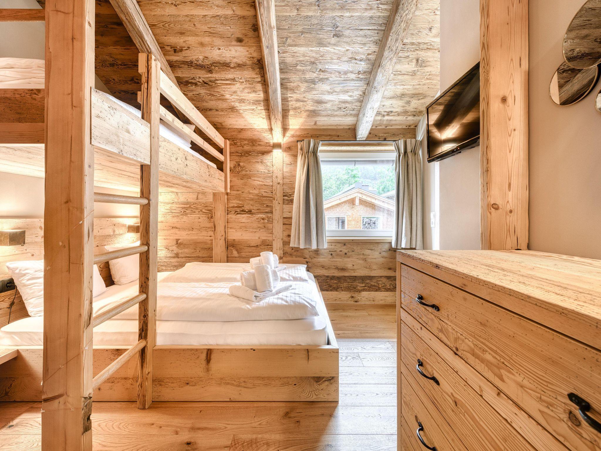 Im Obergeschoss bieten 3 Schlafzimmer mit 3 Bädern ein luxuriöses Wohngefühl und erholsamen Schlaf. Die Altholz Vertäfelung verleiht dem Chalet ein heimeliges und warmes Ambiente.