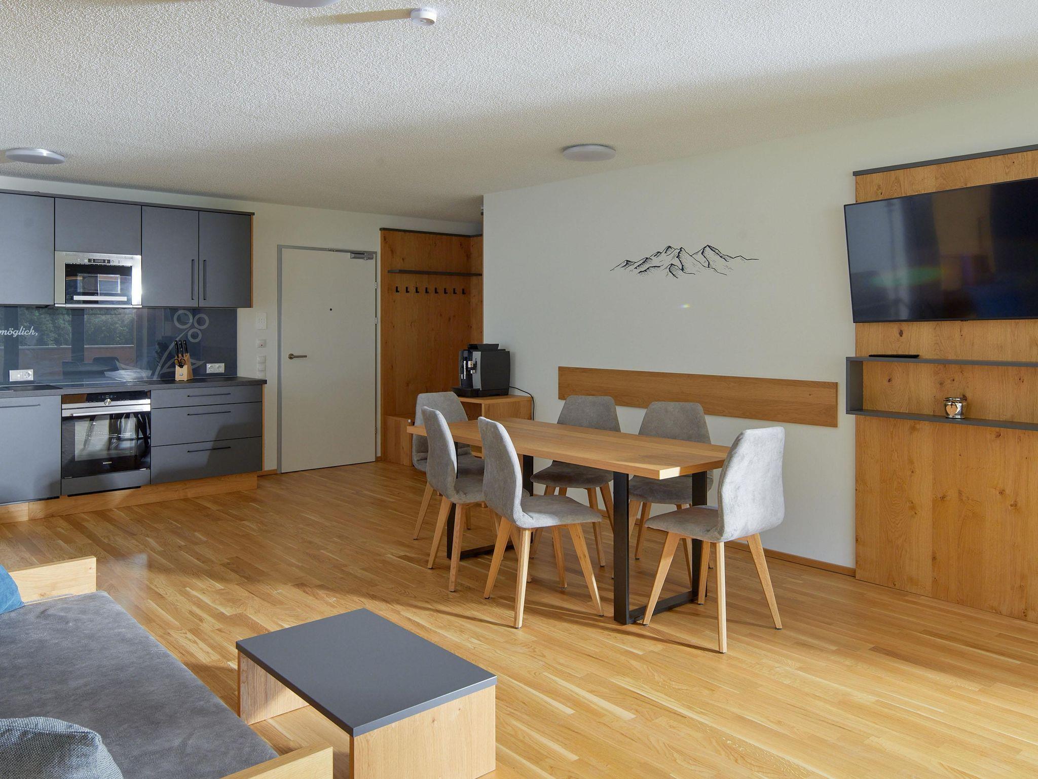 Willkommen im Zapfig Living Apartment 33, Deinem perfekten Rückzugsort für einen erholsamen Aufenthalt. Die 80 m² Unterkunft im 2.Stock bietet ein gemütliches Wohnzimmer inkl. ausziehbaren Kingsizebett mit Smart-TV, 2 Schlafzimmer (Kingsizebett+ausziehbares Einzelbett+Smart-TV) sowie eine voll ausgestattete Küche. Die 2 Badezimmer verfügen über Dusche und WC. Genieße den Komfort einer eigenen Unterkunft+entspanne in alpiner Umgebung. Vom Balkon mit Liegenstühlen besteht Bergblick.