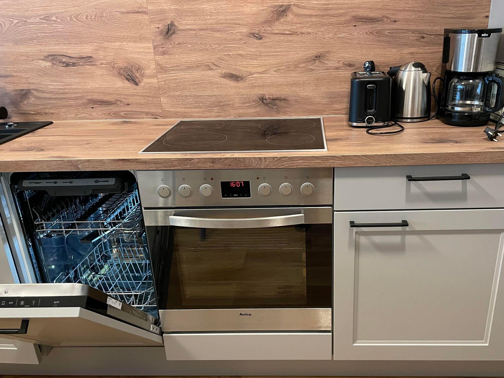Die offene Küche ist komplett ausgstattet und verfügt über einen Backofen mit Induktionsherd, Filter-Kaffeemaschine (Filter Nr. 4), Wasserkocher, Toaster und Kühlschrank mit Gefrierfach.