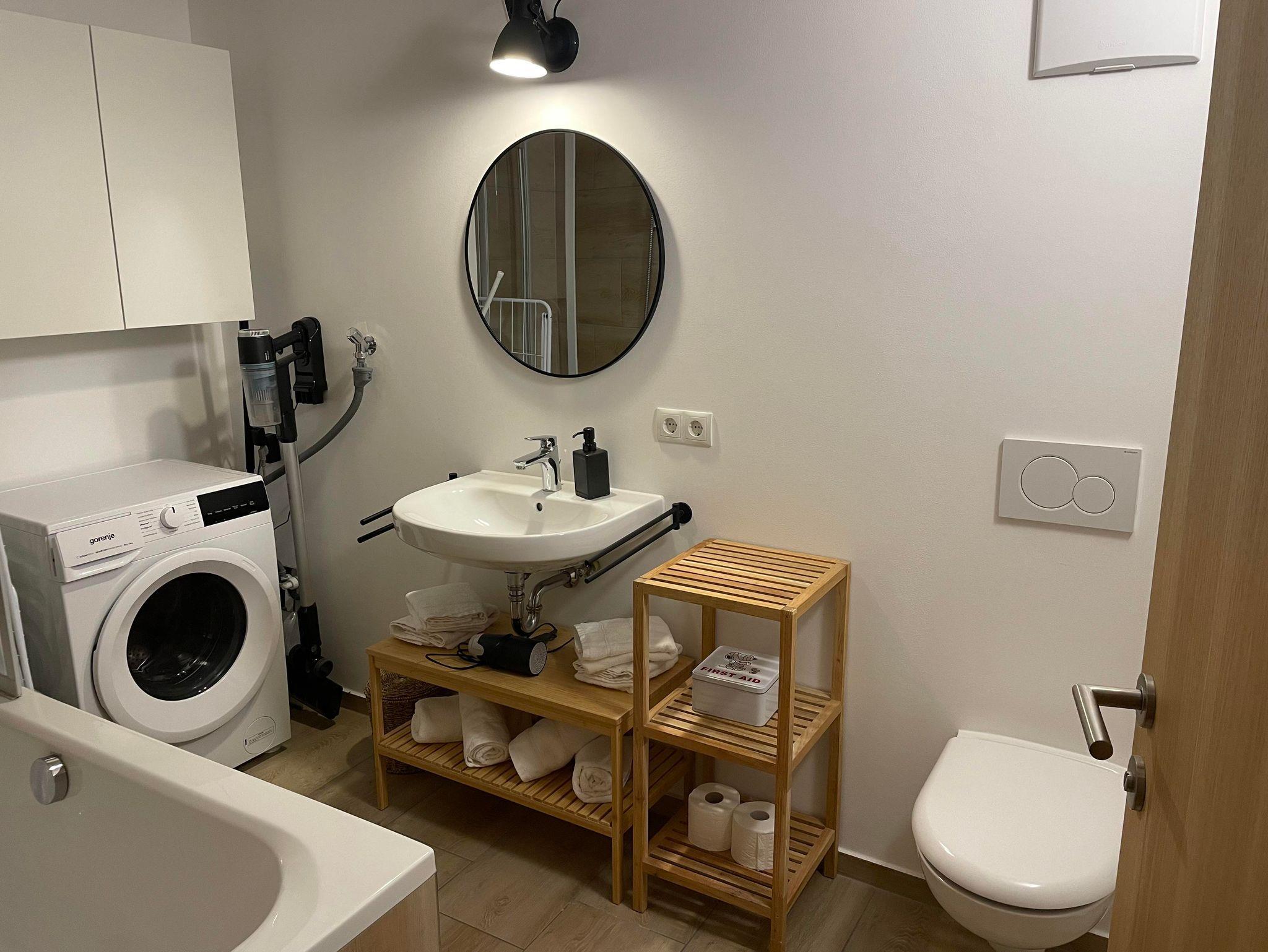 Ein Schlafzimmer hat ein Doppelbett sowie einen Austritt zum Balkon. Im anderen Schlafzimmer sind 2 Einzelbetten, die bei Bedarf zu einem Doppelbett zusammengeschoben werden können. Ein Babybett ist vorhanden. Zur Wohung gehört auch ein überdachter Carport-Stellplatz (Nr. 2). Das Badezimmer verfügt über eine Badewanne inkl. Dusche sowie über eine Waschmaschine mit Trockner. Ein Haartrockner ist vorhanden. WLAN ist inklusive.