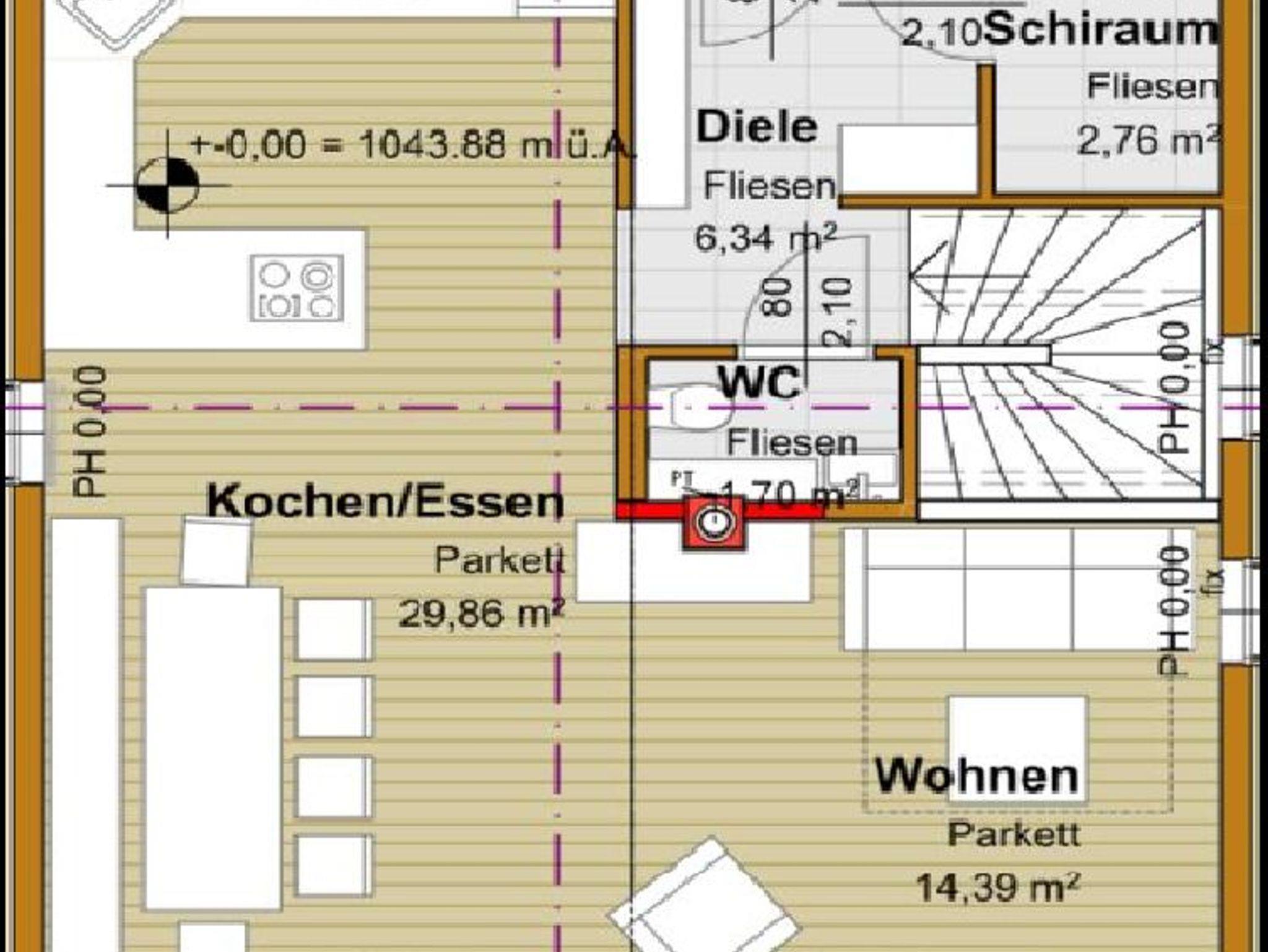 Eingang auf Straßenniveau; Halle mit eigenem Skiraum mit Schuhtrockner; geräumiger Wohnraum mit Designerküche als Highlight - ausgestattet mit allen Geräten und Kücheninsel. Ein sehr geräumiger Essbereich, sowie ein Sitzbereich mit ausreichend und bequemen Sitzgelegenheiten. Der Balkon ist vom Wohnzimmer aus durch eine Schiebetür zugänglich.