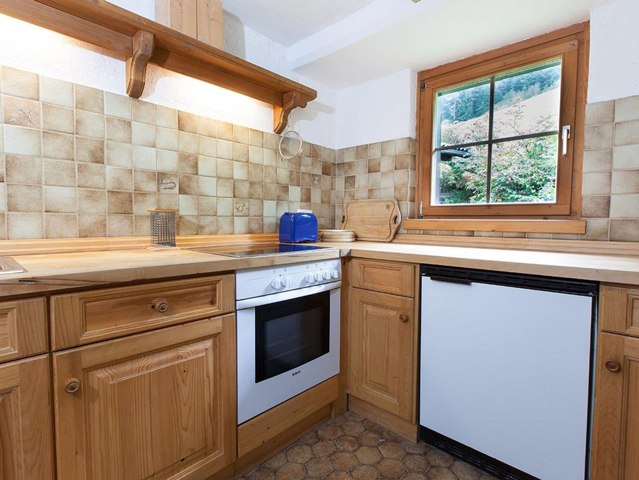 Die Küche im Erdgeschoss ist voll ausgestattet inkl. Herd mit Ceranfeld, Ofen, Fondueset, Toaster, Kaffeemaschine und Spühlmaschine. Die Küche verfügt noch über die 300 Jahre alte Tür.