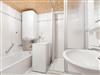Badezimmer 1. OG mit Duschbadewanne, Toilette und Föhn.