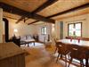 Das große Wohnzimmer im Erdgeschoss ist großzügig angelegt, hat einen Kamin, ein Sofa und einen Essbereich. Das Sofa kann zu einem 200cm x 140cm Bett ausgeklappt werden.
