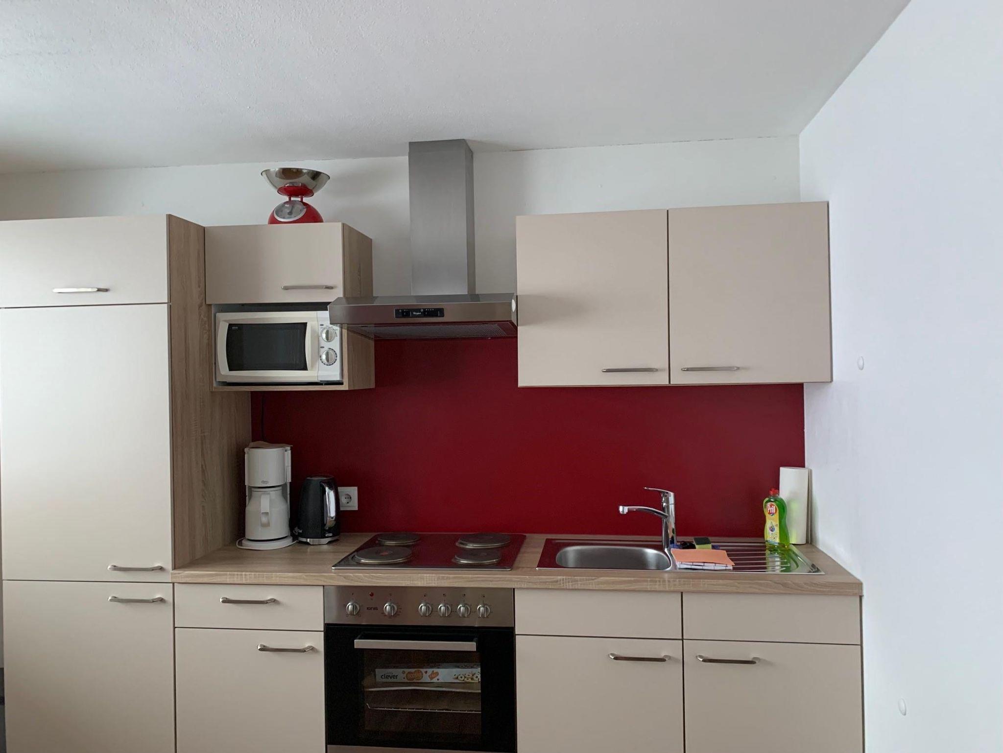 Die Küchenzeile besteht aus Mikrowelle, Kaffeemaschine, Kühlschrank mit Tiefkühlfach, Geschirrspüler, Backofen, Wasserkocher, Geschirr ausreichend vorhanden.