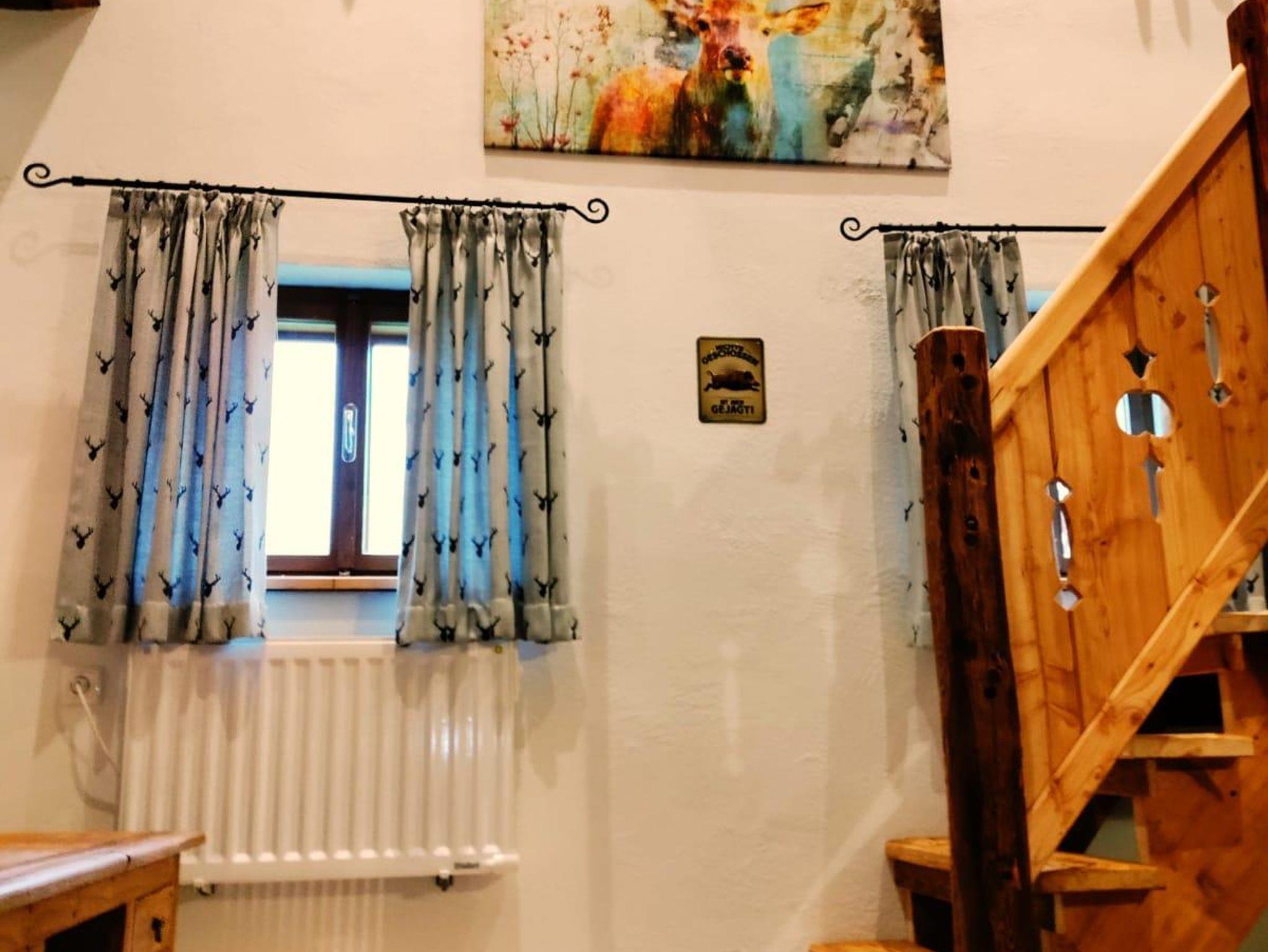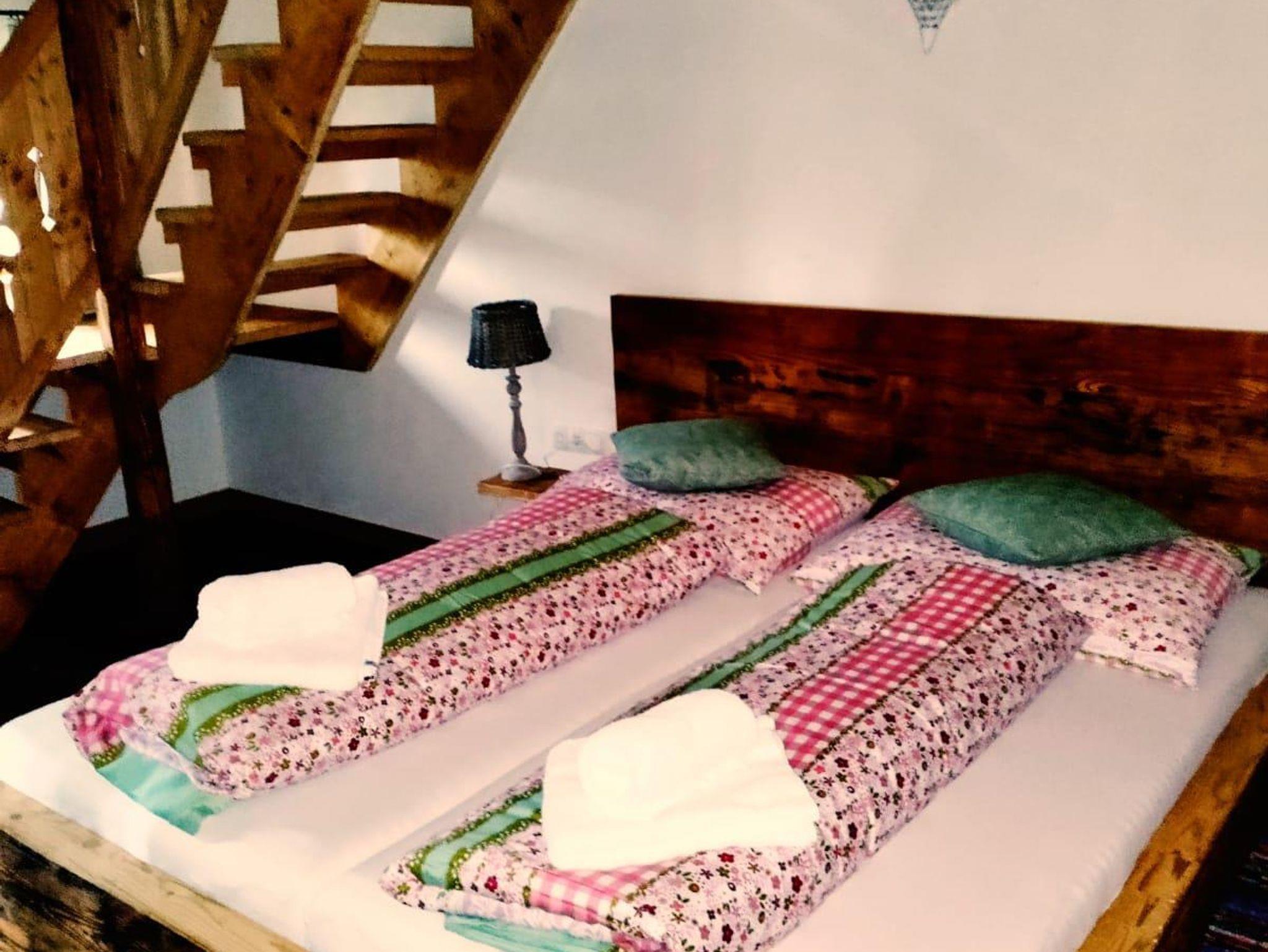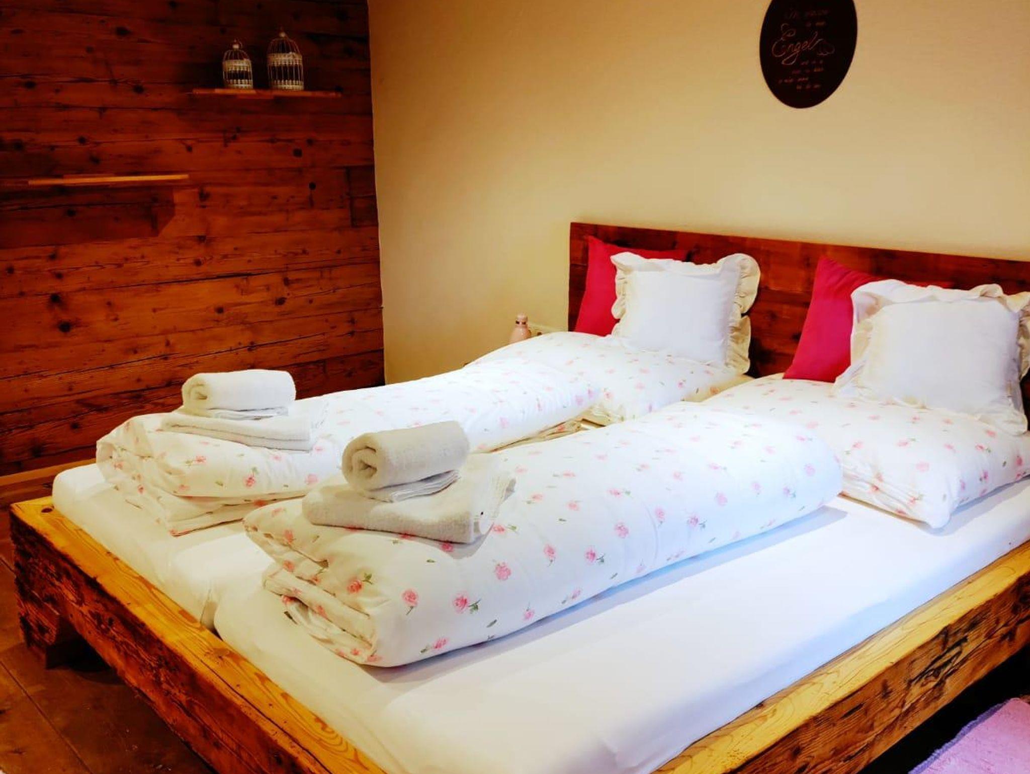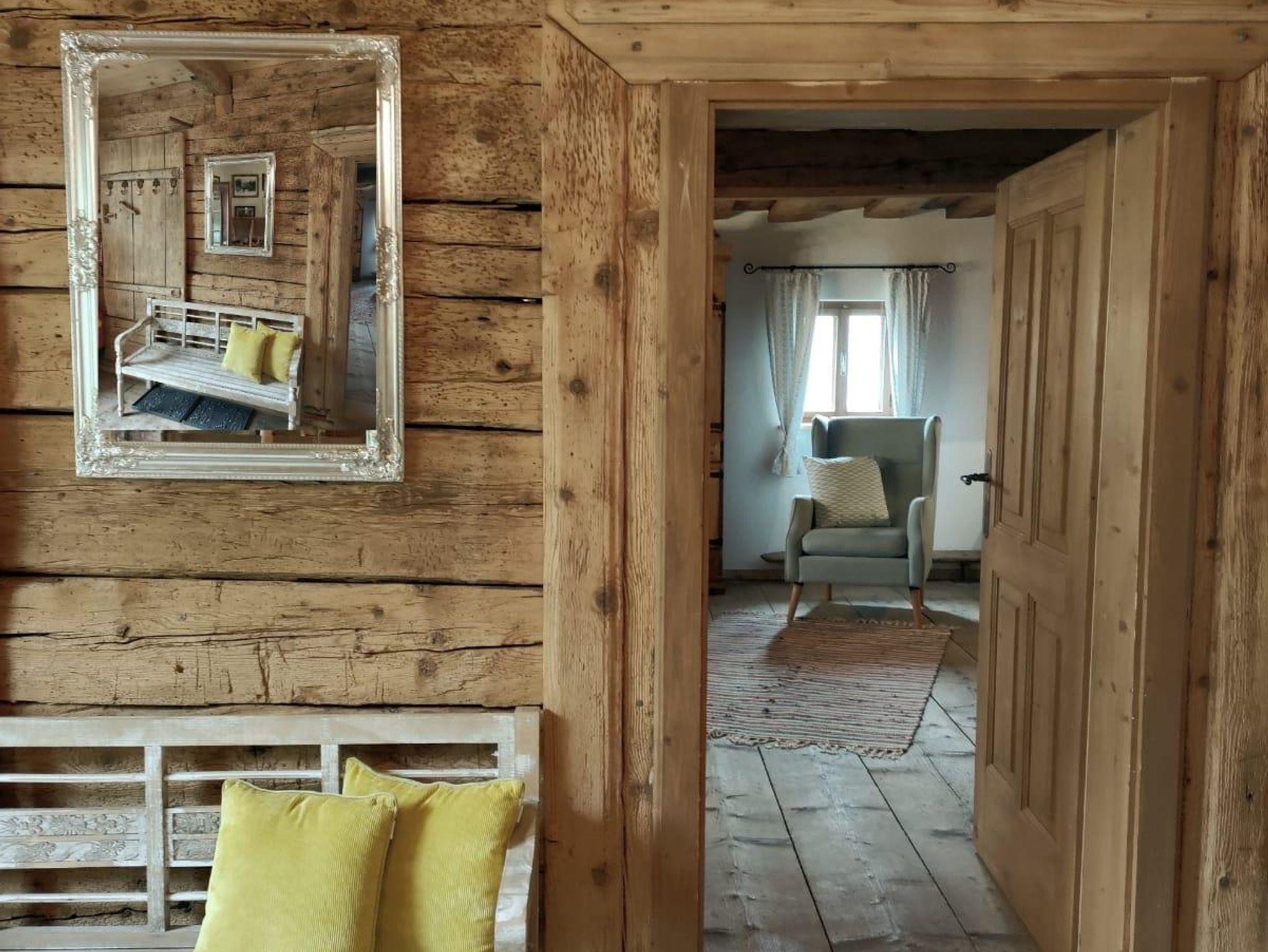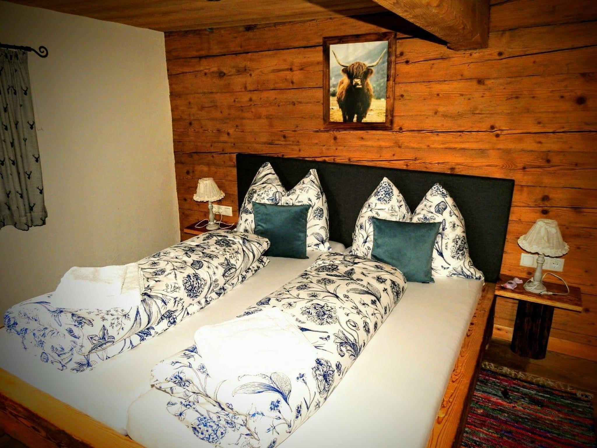 Im zweiten Stock befinden sich die anderen beiden Doppelzimmer mitDoppelbetten aus Altholz, ein Badezimmer mit Dusche/WC und ein großzügiggestaltetes Vorhaus mit Lese Ecke, Sofa und FLAT-TV