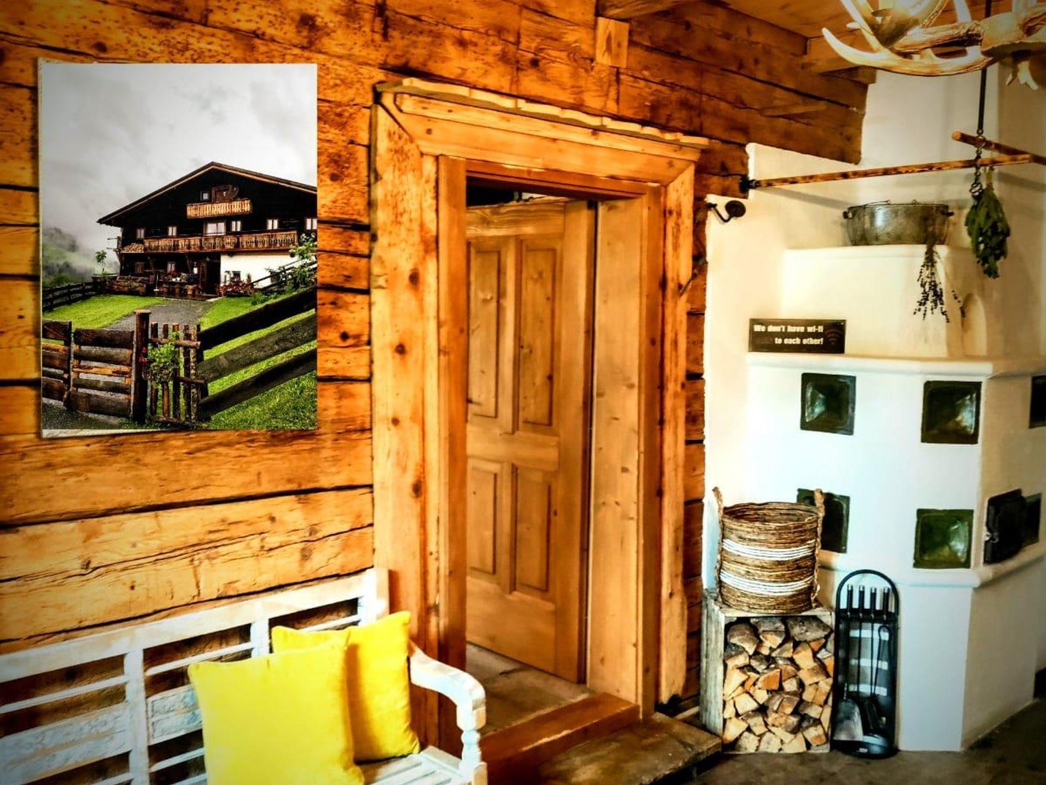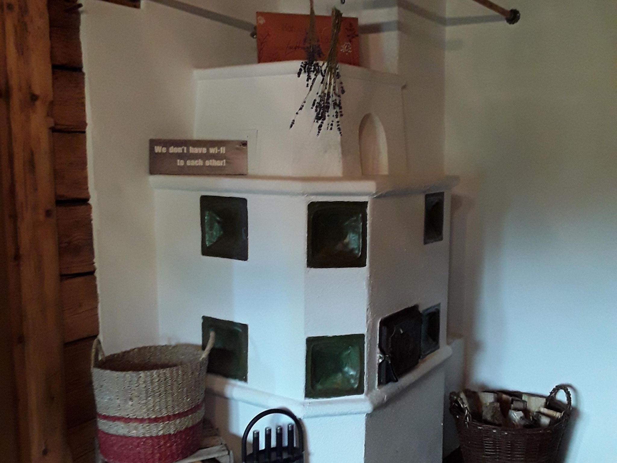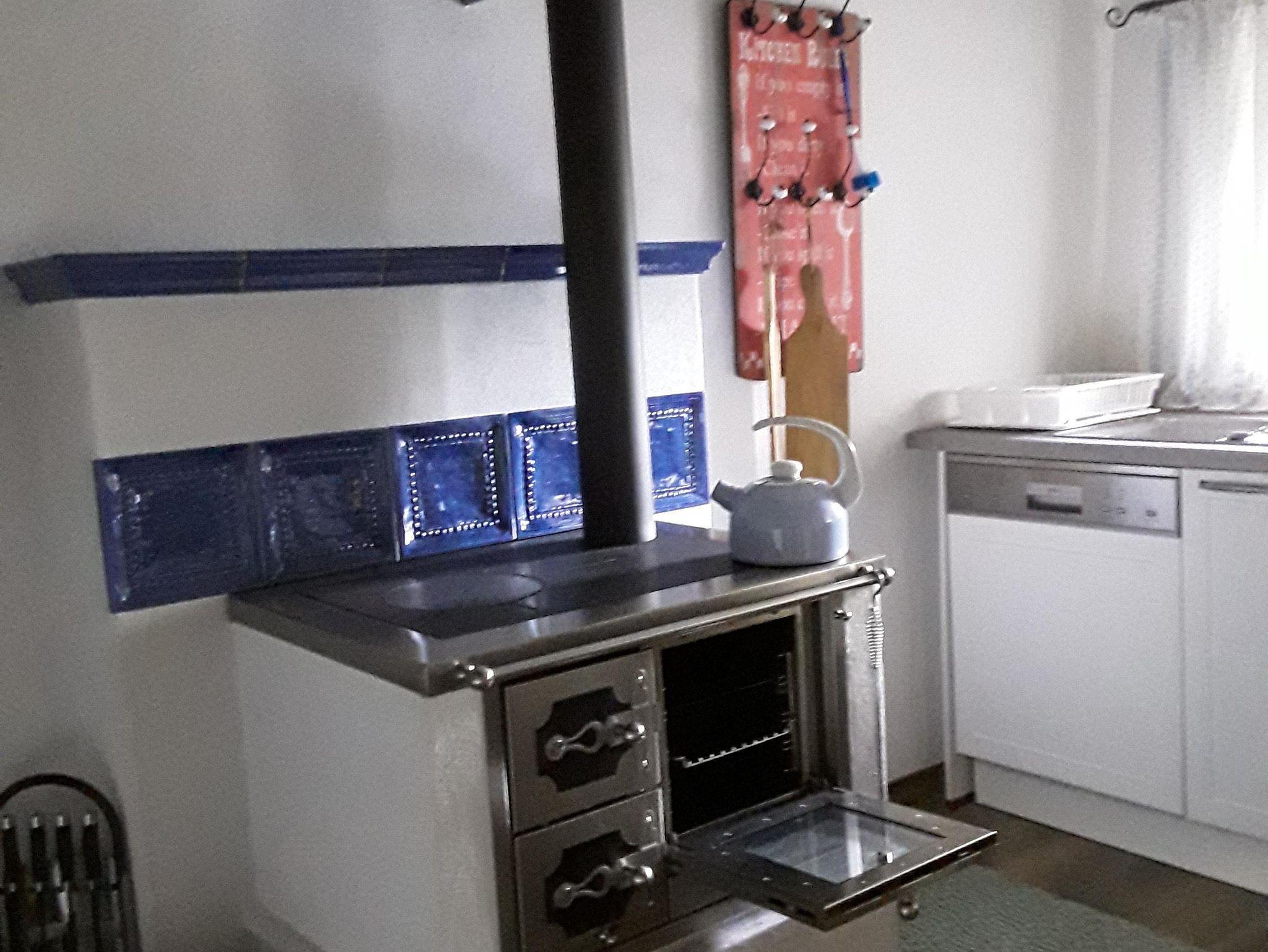 Im Erdgeschoß ist die komplett ausgestattete Küche mit Holzofen, eine heimelige Stube mit Kachelofen, Sofa und FLAT-TV