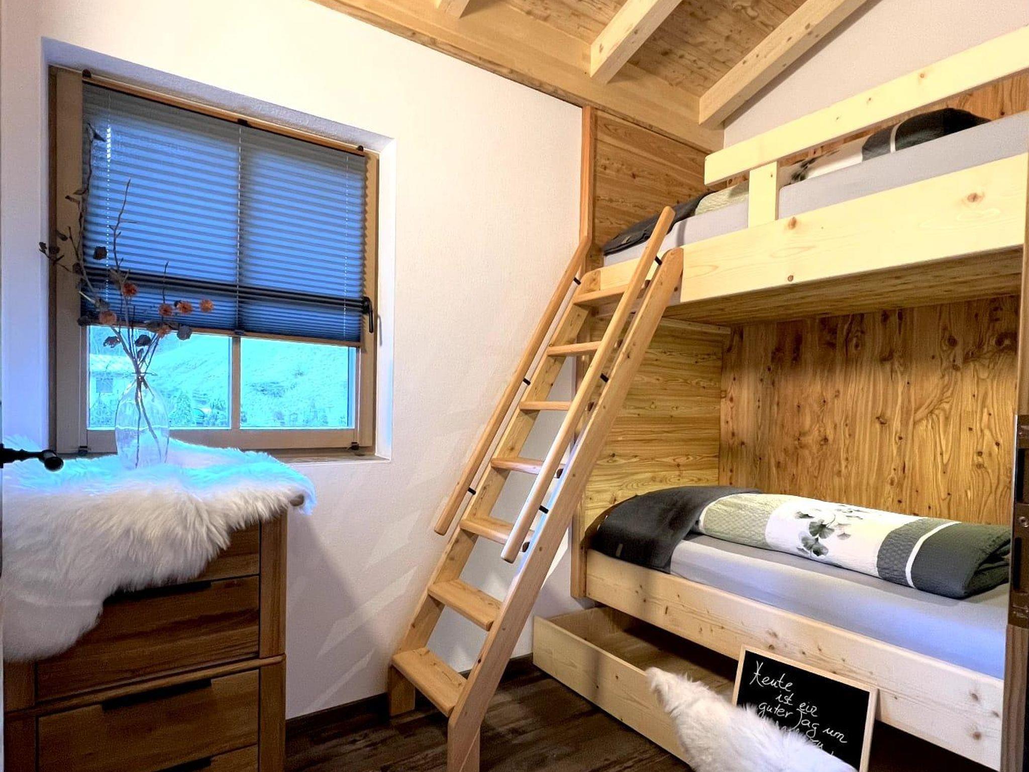 Im Unteren Geschoss befindet sich ein WC, eine Dusche, zwei Schlafzimmer mit je einem Doppelbett und die ausziehbare Couch in einer Nische. Ein Skischuhtrockner und ein kleiner Ruheraum. Von dort gelangt man in den Außenberreich mit Sauna, Garten und Griller.