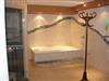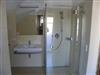 • Badezimmer mit Doppelwaschbecken, Dusche, WC, Föhn und Handtuchtrockner,