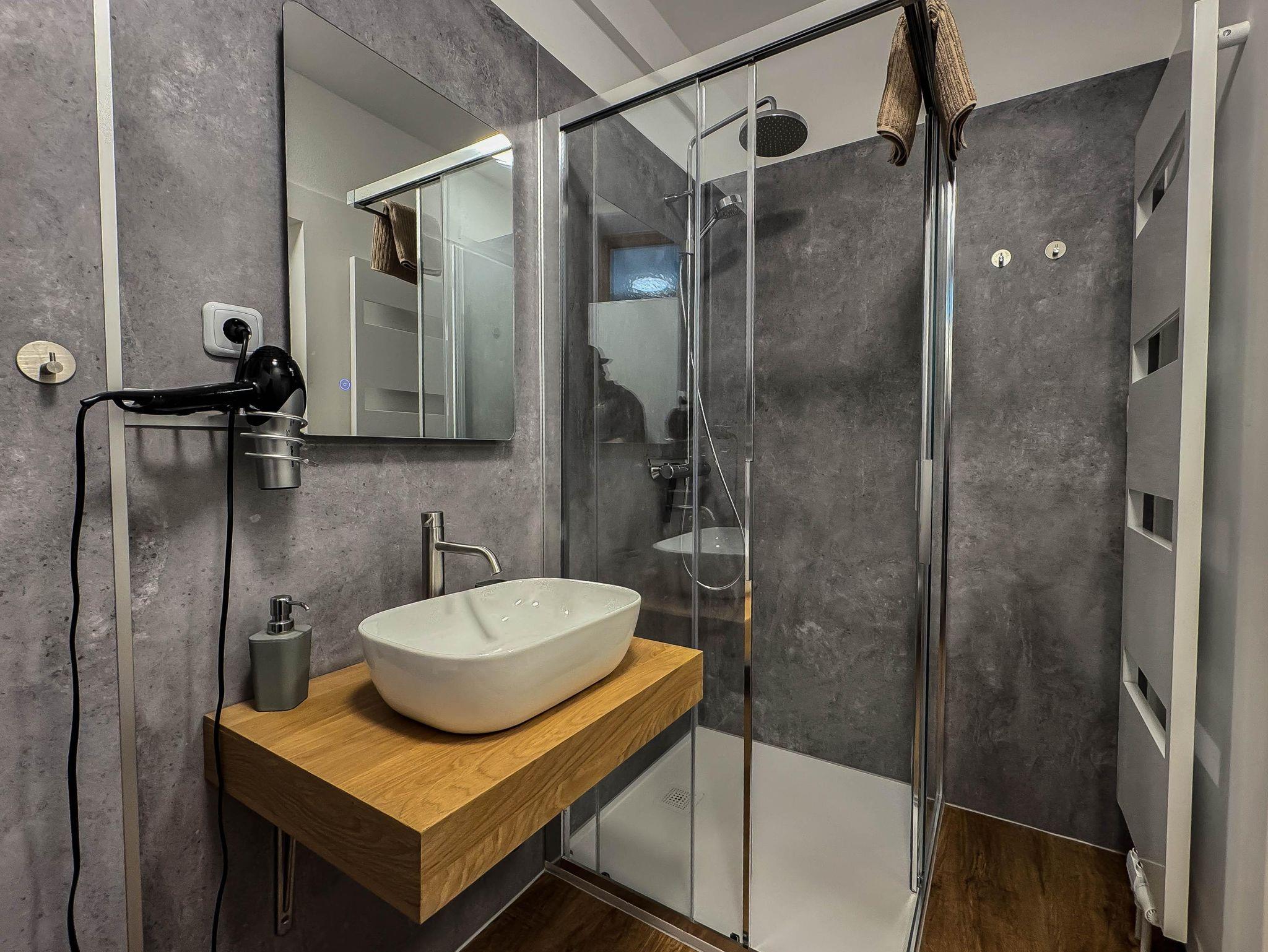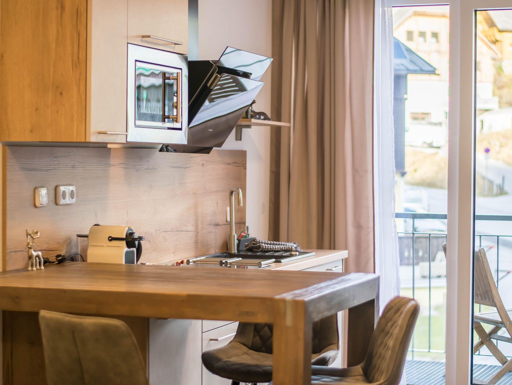 Das Appartement/Studio ist unter dem Motto „Nostalgie trifft Modern“ eingerichtet. Eine behagliche Essecke, eine voll ausgestattete Küche mit Wohnbereich und ein Kaffeevollautomat stehen bereit. Aus dem Fenster genießen Sie einen traumhaften Blick auf die umliegenden Gipfel und Skipisten, die nur 50 Meter entfernt sind.